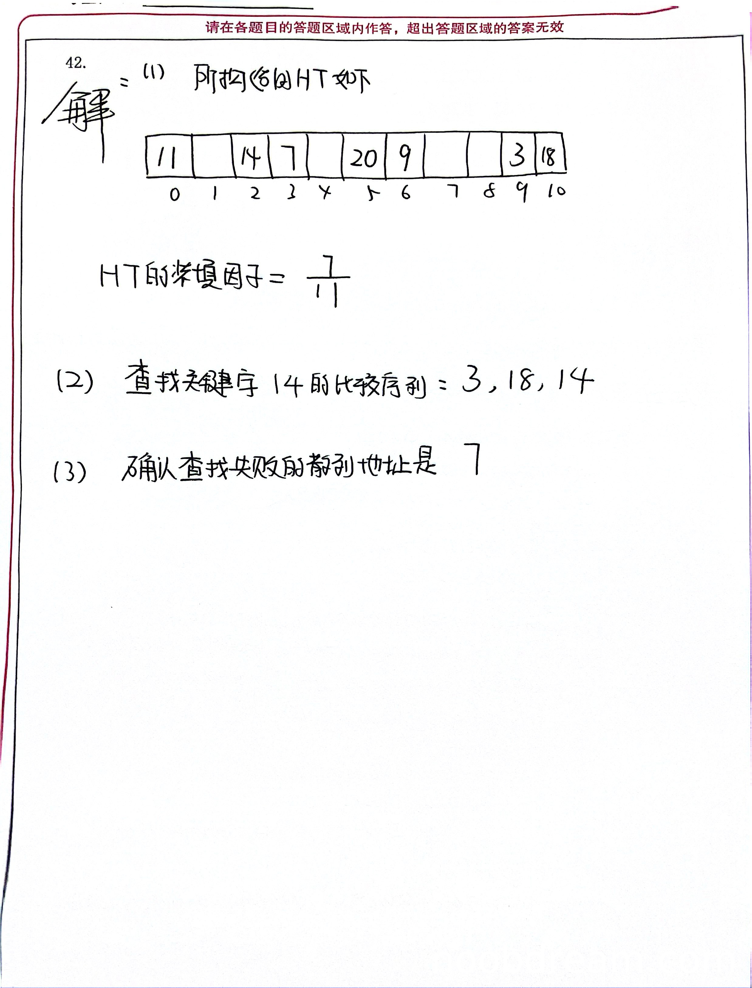 学生正确计算了所有关键字的散列地址,并正确构造了散列表HT:位置0存储11,位置2存储14,位置3存储7,位置5存储20,位置6存储9,位置9存储3,位置10存储18。装填因子计算为7/11,与标准答案一致。但学生作答中散列表的图示存在格式问题(位置1、4、7、8未明确标注为空),由于不影响核心逻辑判断,不扣分。因此得6分。