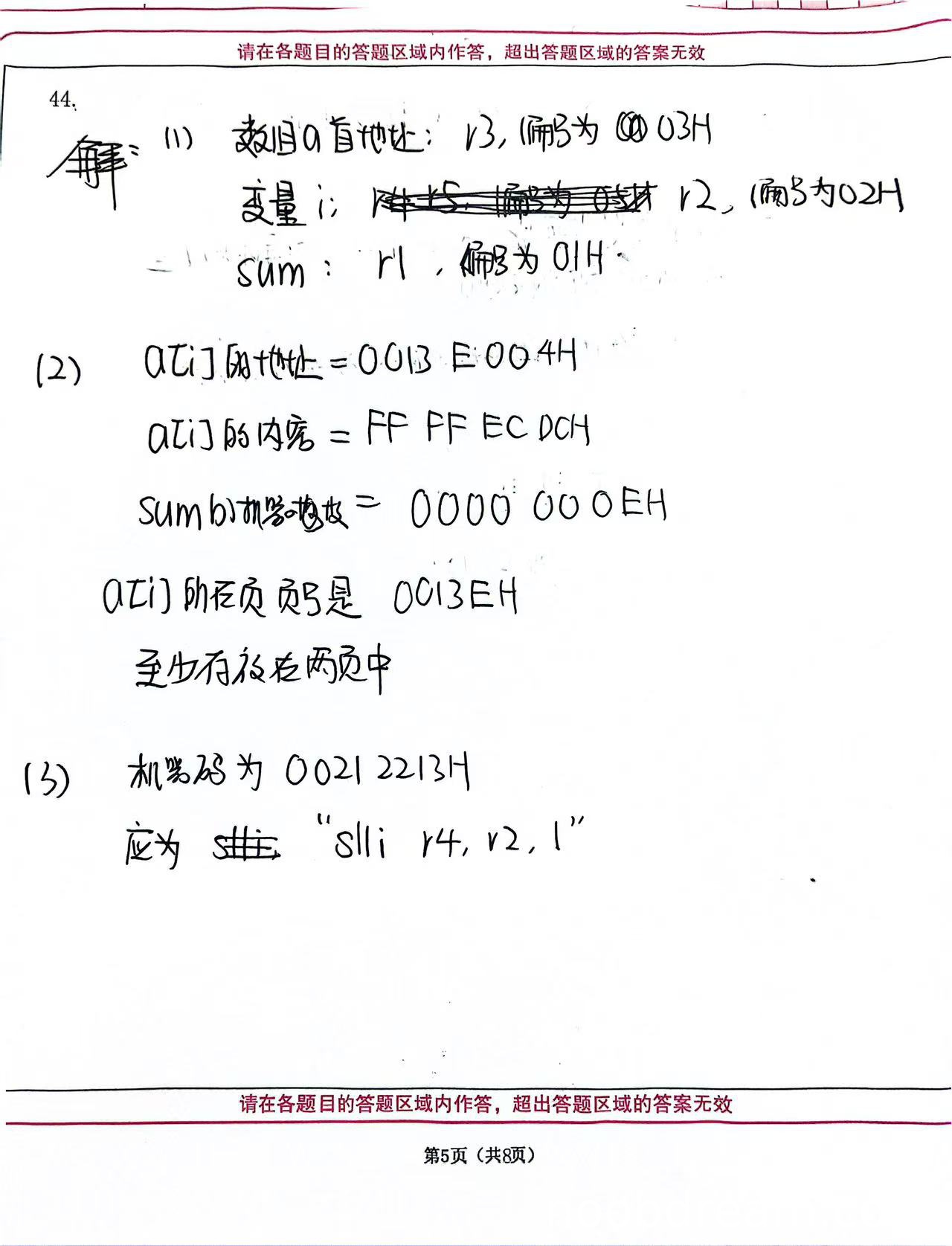学生答案中: - a[i]地址0013E004H正确 ✓ - a[i]内容FFFFECDCH正确 ✓ - sum机器数0000000EH正确 ✓ - 页号0013EH正确 ✓ - 至少存放在两页中正确 ✓ 所有关键点都正确,得5分。