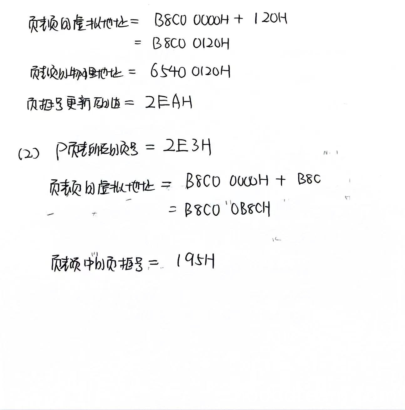 学生答案中,页表项的虚拟地址为B8C0 0120H,物理地址为6540 0120H,页框号更新后的值为2EAH,与标准答案完全一致。计算过程正确,逻辑清晰。因此得3分。