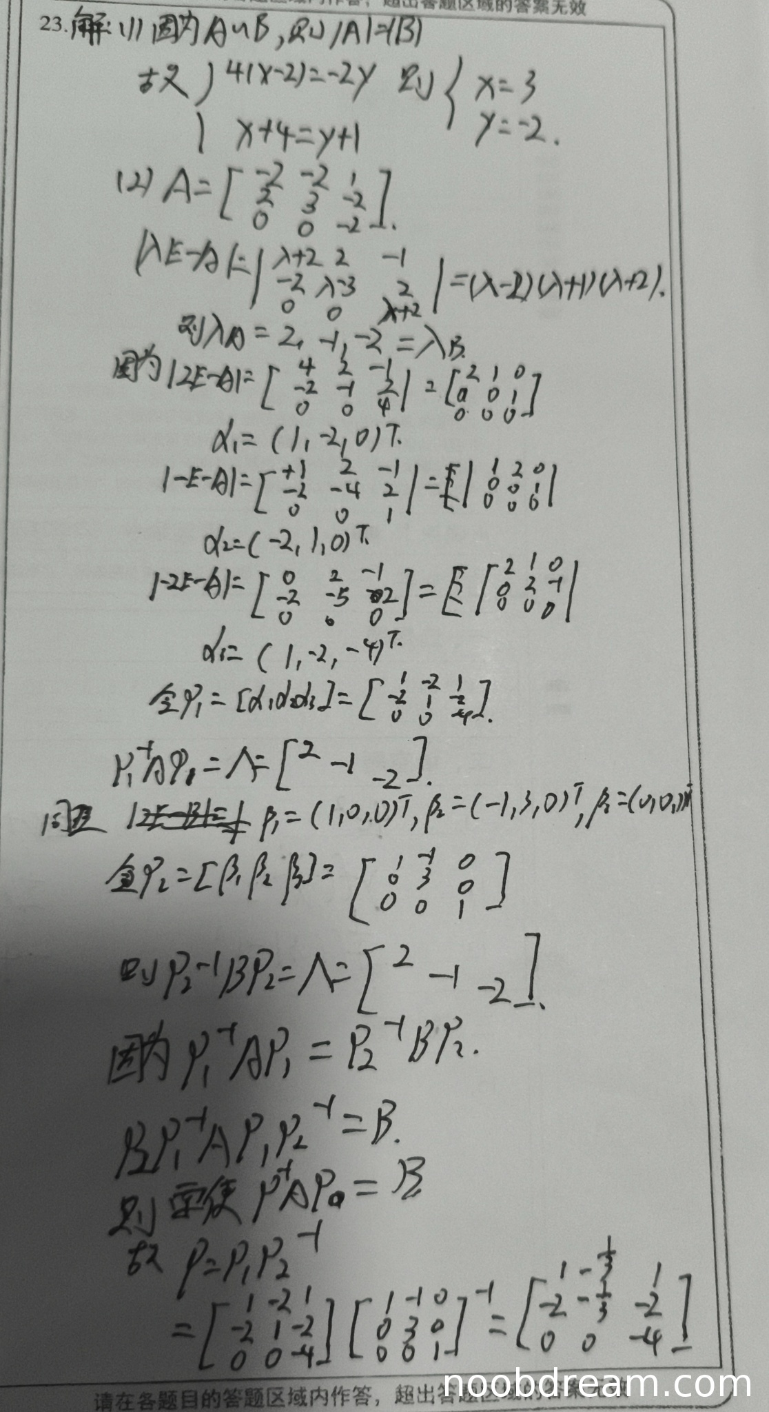 学生通过行列式相等和迹相等建立方程组,得到x=3,y=-2,与标准答案一致。但在计算行列式时,学生给出的矩阵A为$\begin{bmatrix}2&-2&1\\0&3&-2\\0&0&2\end{bmatrix}$,与原题给出的矩阵A不一致,这可能是识别错误。考虑到学生最终得到了正确的x,y值,且计算过程逻辑正确,给4分(扣1分因为矩阵写错但结果正确)。