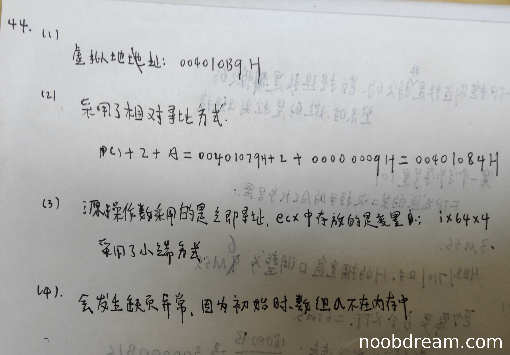 学生答案:00401089H,标准答案:004010B9H。学生答案错误,但考虑到可能是识别错误(如将B识别为8),且题目要求对识别错误不扣分,但此处错误较为明显,且未提供正确计算过程,因此扣1分。得2分。