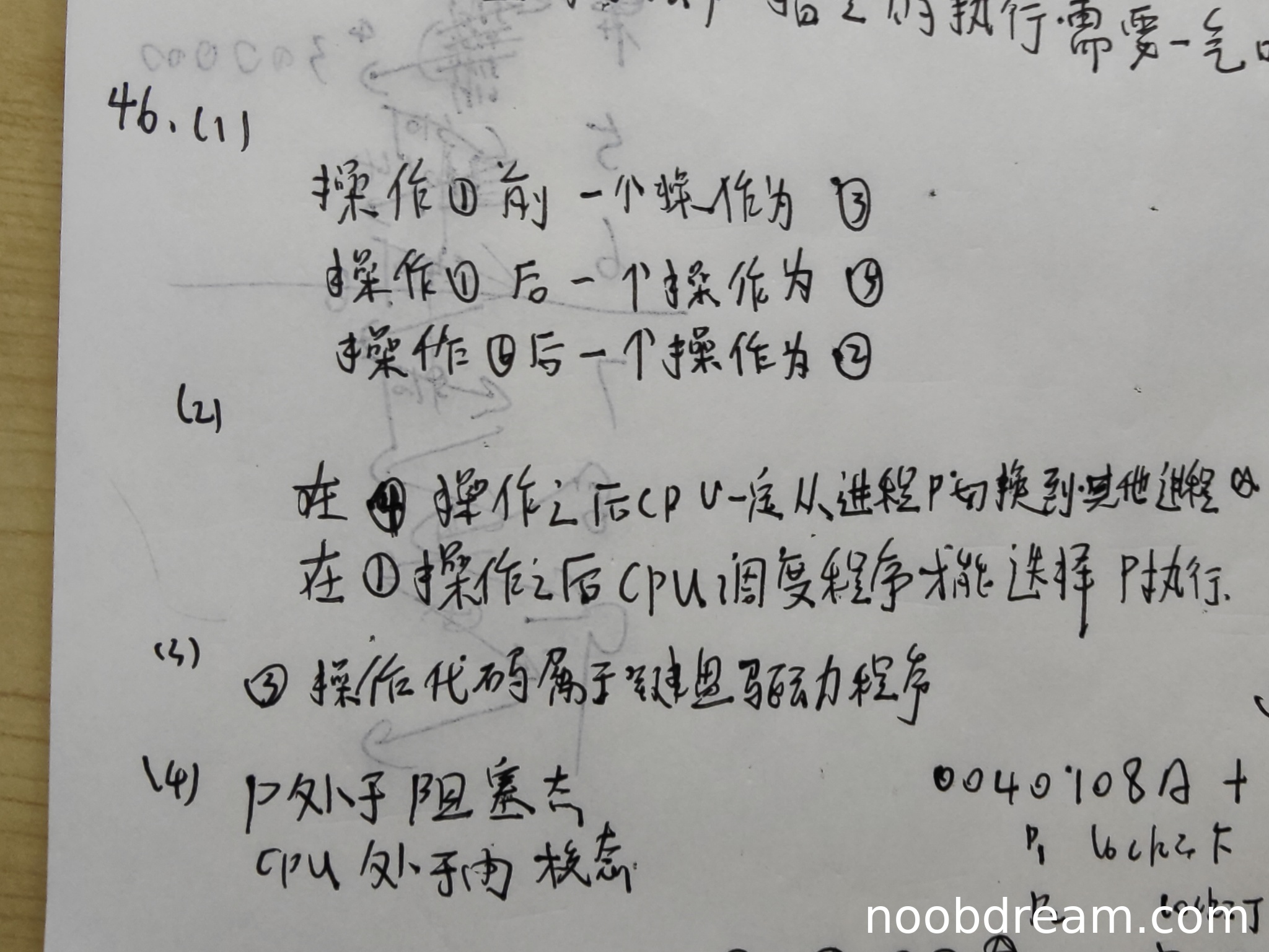 第二问:学生回答"在①操作之后CPU调度程序才能选择P执行"与标准答案完全一致,得1分。