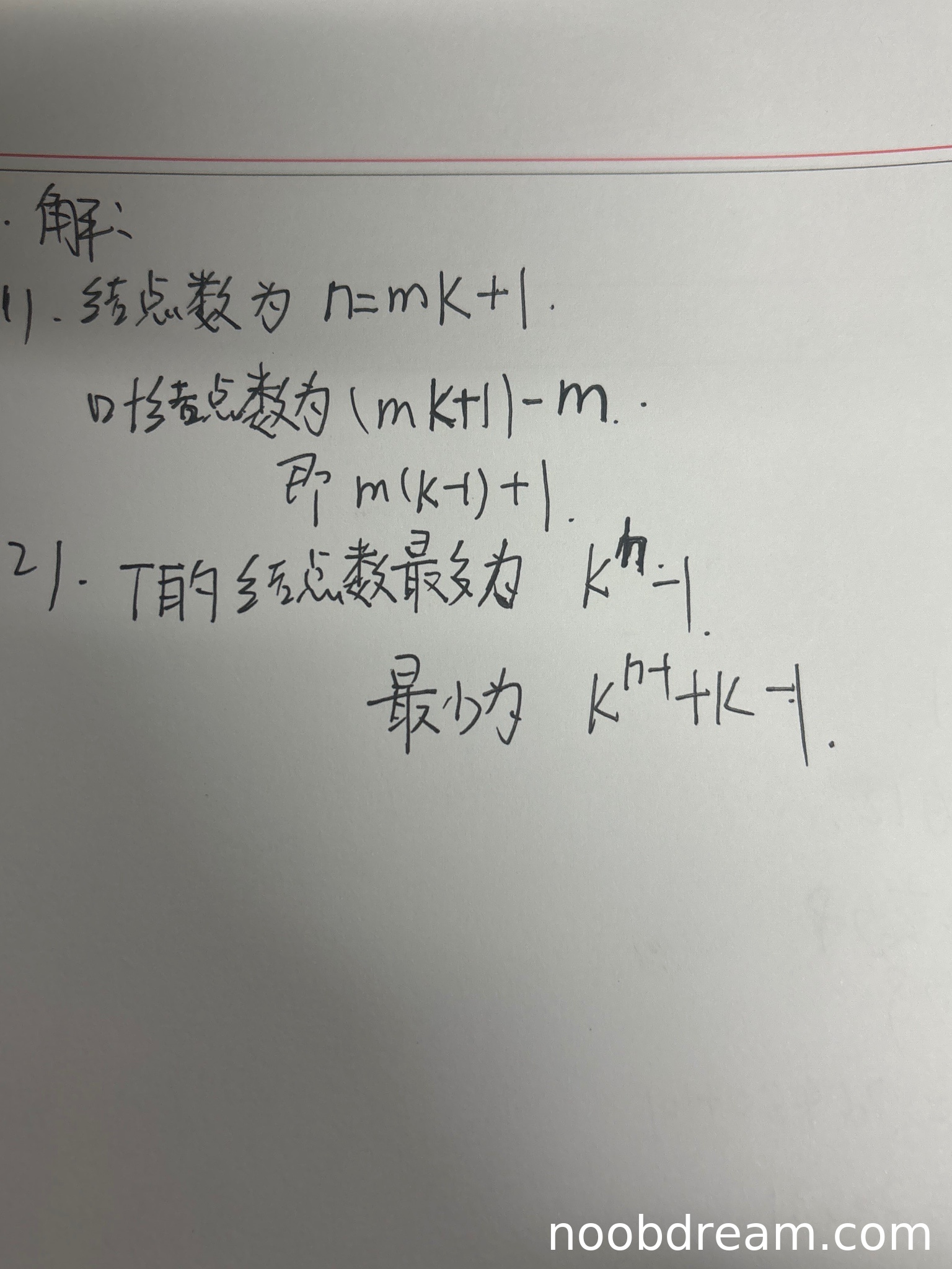 学生答案中推导过程:结点总数 \(n = mk + 1\),叶结点数为 \((mk + 1) - m = m(k - 1) + 1\)。这与标准答案 \(n_0 = (k - 1) \times m + 1\) 完全一致,推导逻辑正确(通过结点总数减去非叶结点数得到叶结点数)。因此得3分。