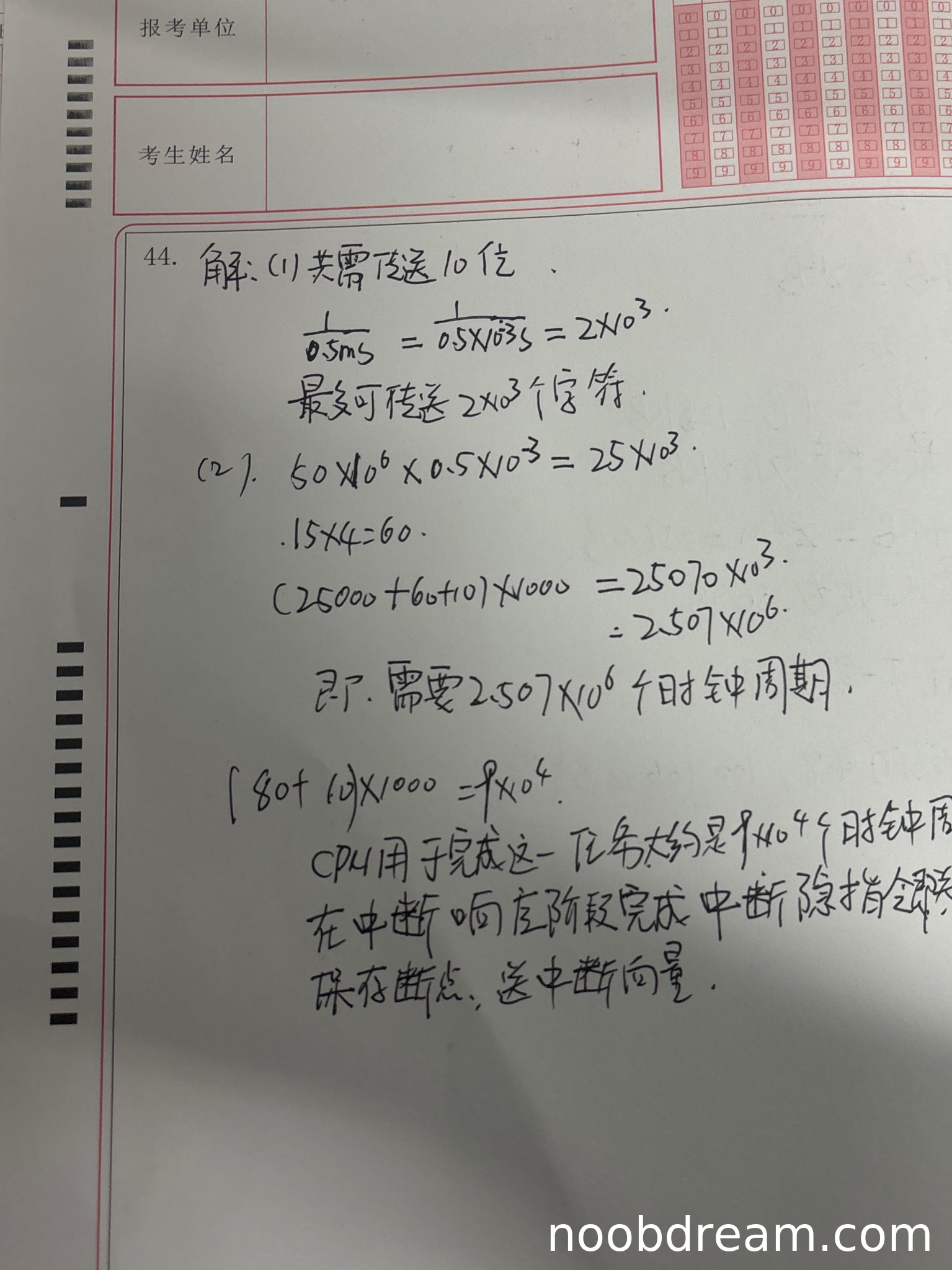 学生计算一个字符传送时间时,考虑了设备D将字符送I/O端口的时间(25000个时钟周期)、中断响应时间(10个时钟周期)和中断服务程序前15条指令执行时间(60个时钟周期),合计25070个时钟周期,与标准答案一致。完成1000个字符传送所需时间计算为2.507×10⁶个时钟周期(即2507000),但标准答案为25070000,此处学生少了一个数量级,属于计算错误,扣1分。
