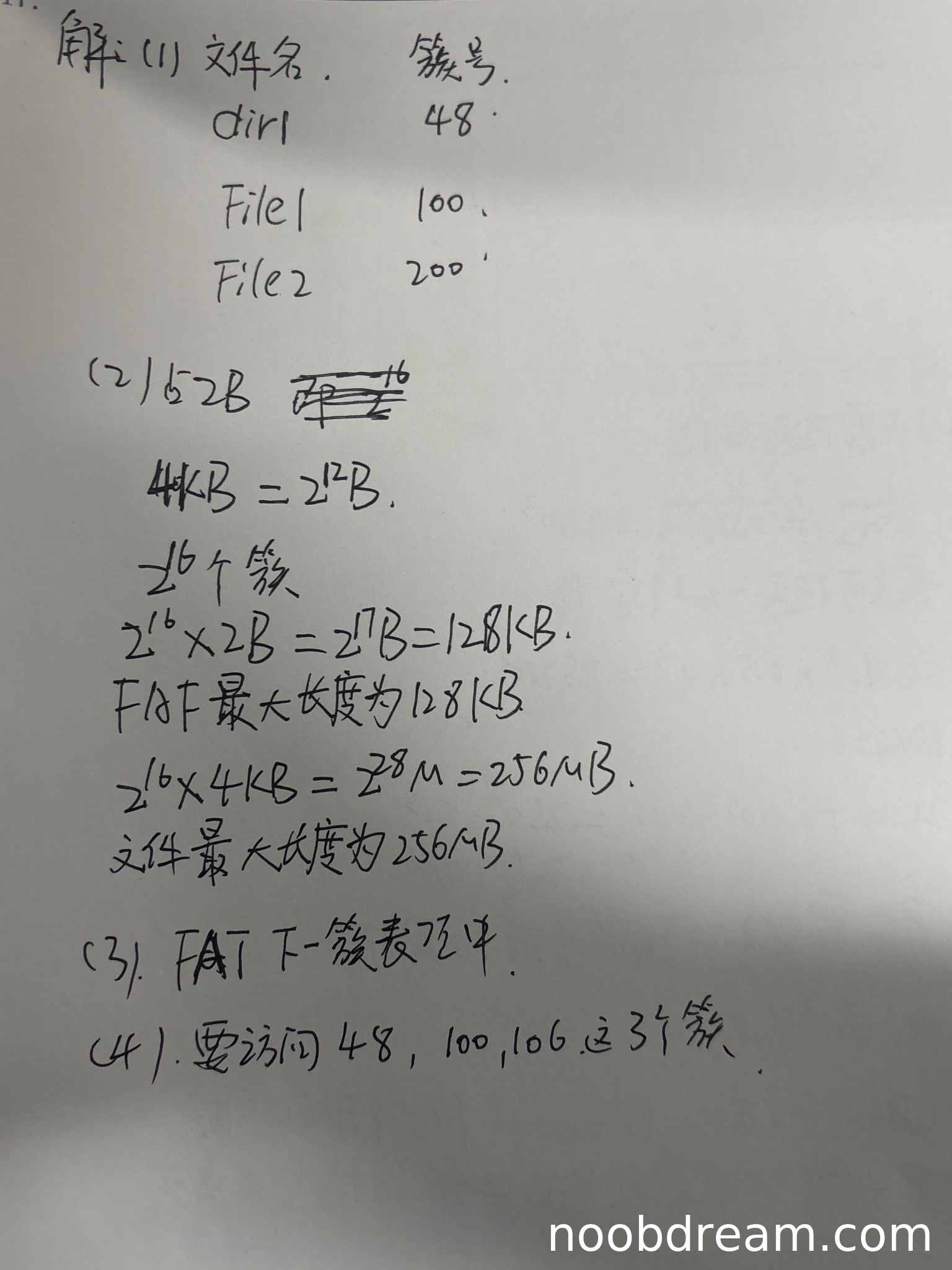 学生正确计算了FAT最大长度为128KB(2¹⁶×2B = 2¹⁷B = 128KB)和文件最大长度为256MB(2¹⁶×4KB = 2²⁸B = 256MB),计算过程和结果均正确。得2分。