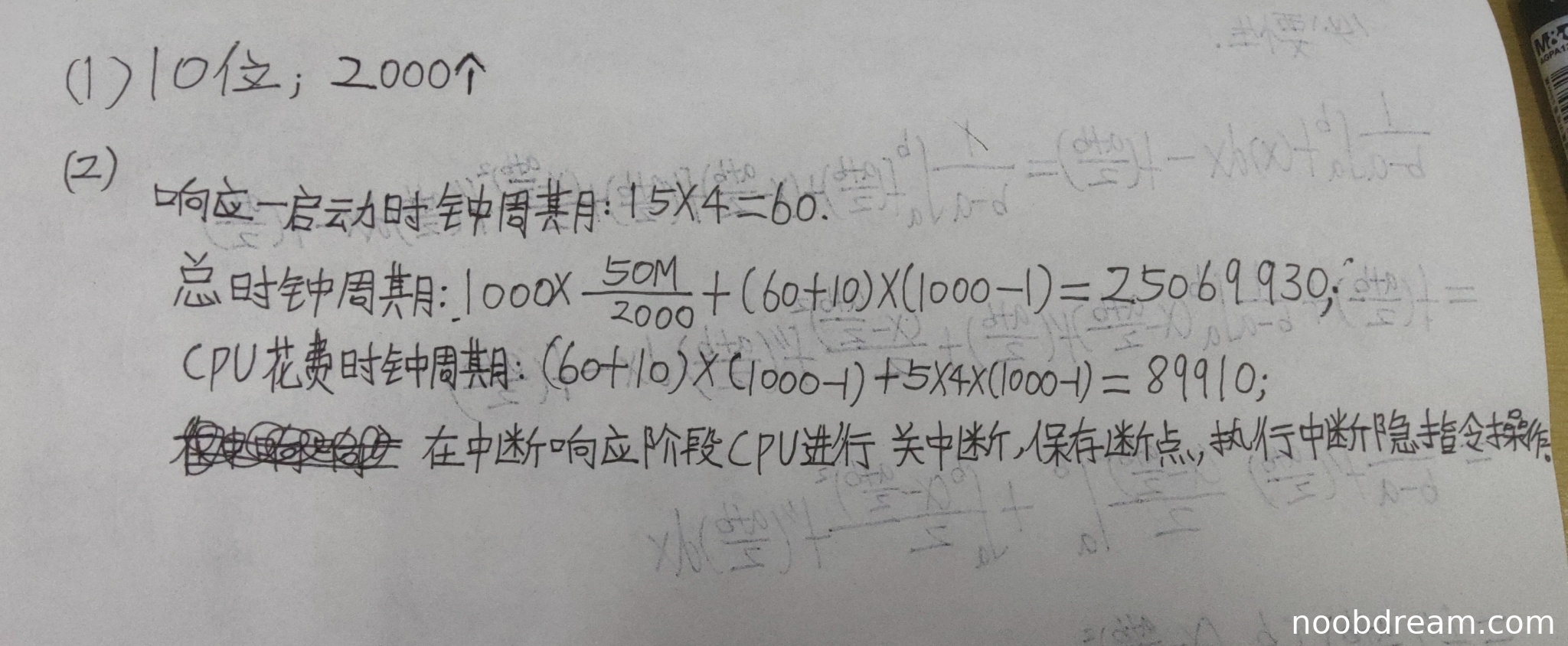 - CPU时钟周期计算:学生计算为89910,标准答案为90000。学生使用了(1000-1)次计算,逻辑错误(应为1000次完整中断服务),扣1分。