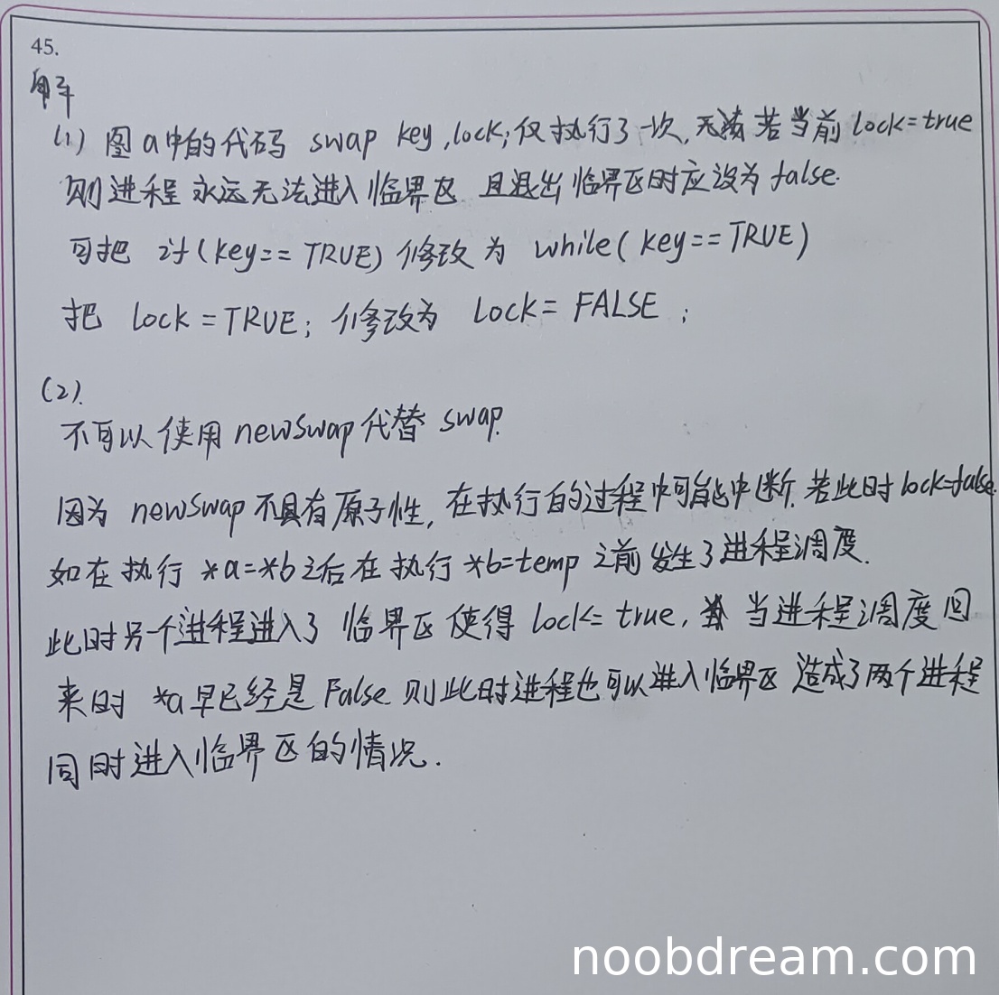 学生正确回答"不可以使用newSwap代替swap",并给出了理由:newSwap不具有原子性,在执行过程中可能中断,导致两个进程同时进入临界区。这与标准答案的核心观点一致,虽然具体举例说明的细节略有不同,但思路正确且解释清晰。因此本题得3分。