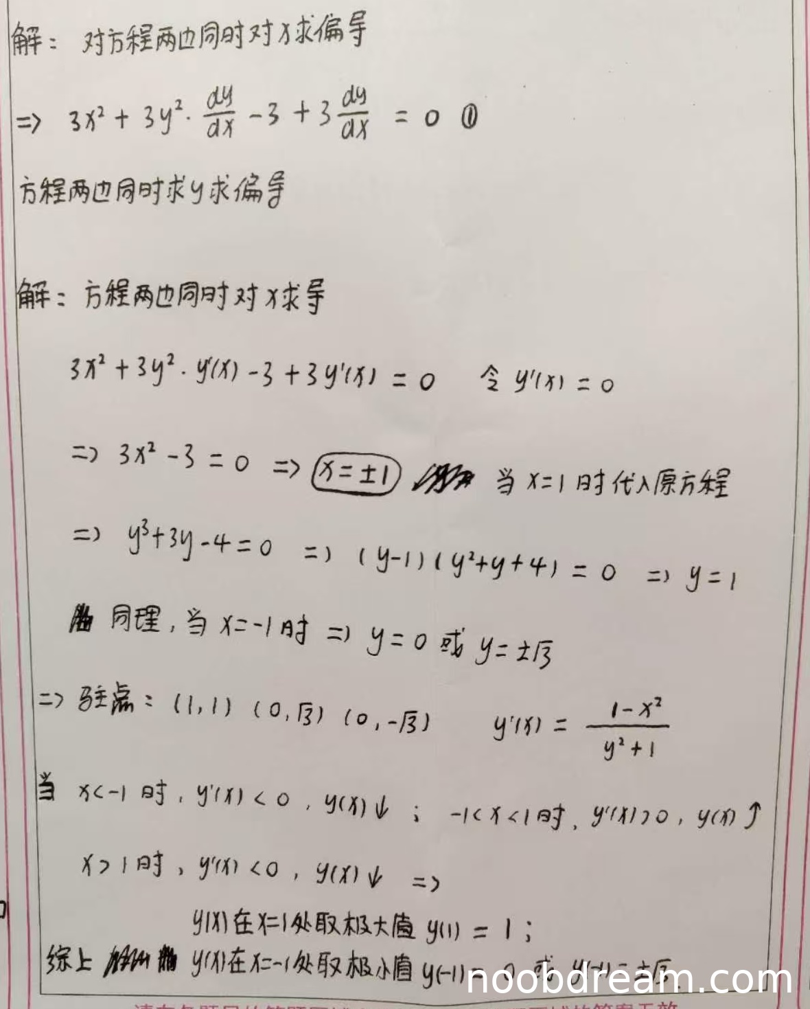 - 求驻点时,当x=-1时,学生得到了y=0或y=±√3,但代入原方程验证:(-1)³+y³-3(-1)+3y-2=0 ⇒ y³+3y=0 ⇒ y(y²+3)=0,只能得到y=0。学生多出了y=±√3的错误解,这是逻辑错误,扣1分。