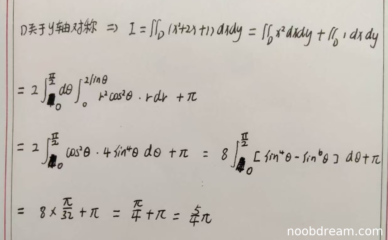 - 在计算∬D1 dxdy时,学生直接给出面积为π,但未说明理由(D是圆心在(0,1)、半径为1的圆,面积应为π)。虽然结果正确,但缺乏解释。