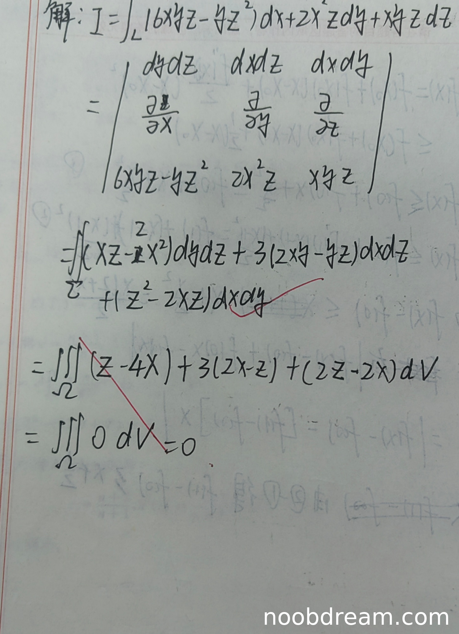 虽然学生正确使用了斯托克斯公式的思路,但由于上述严重错误,只能给予基础思路分。扣分情况:被积函数错误扣2分,行列式计算错误扣3分,方法混淆扣4分,结果错误扣2分。