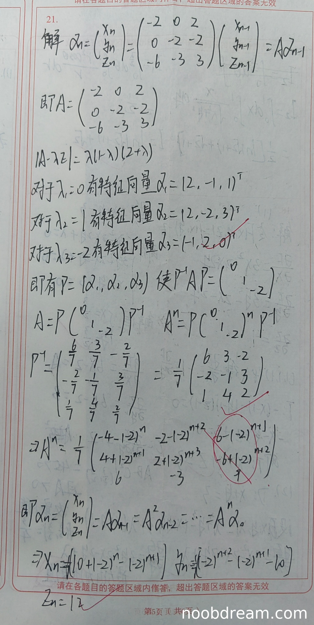 学生正确写出\(\alpha_n=A^n\alpha_0\)的关系,但具体计算结果\(x_n,y_n,z_n\)与标准答案不符,这是由前面\(A^n\)计算错误导致的逻辑错误。其中\(z_n=12\)正确,但\(x_n,y_n\)表达式错误。扣2分,得2分。