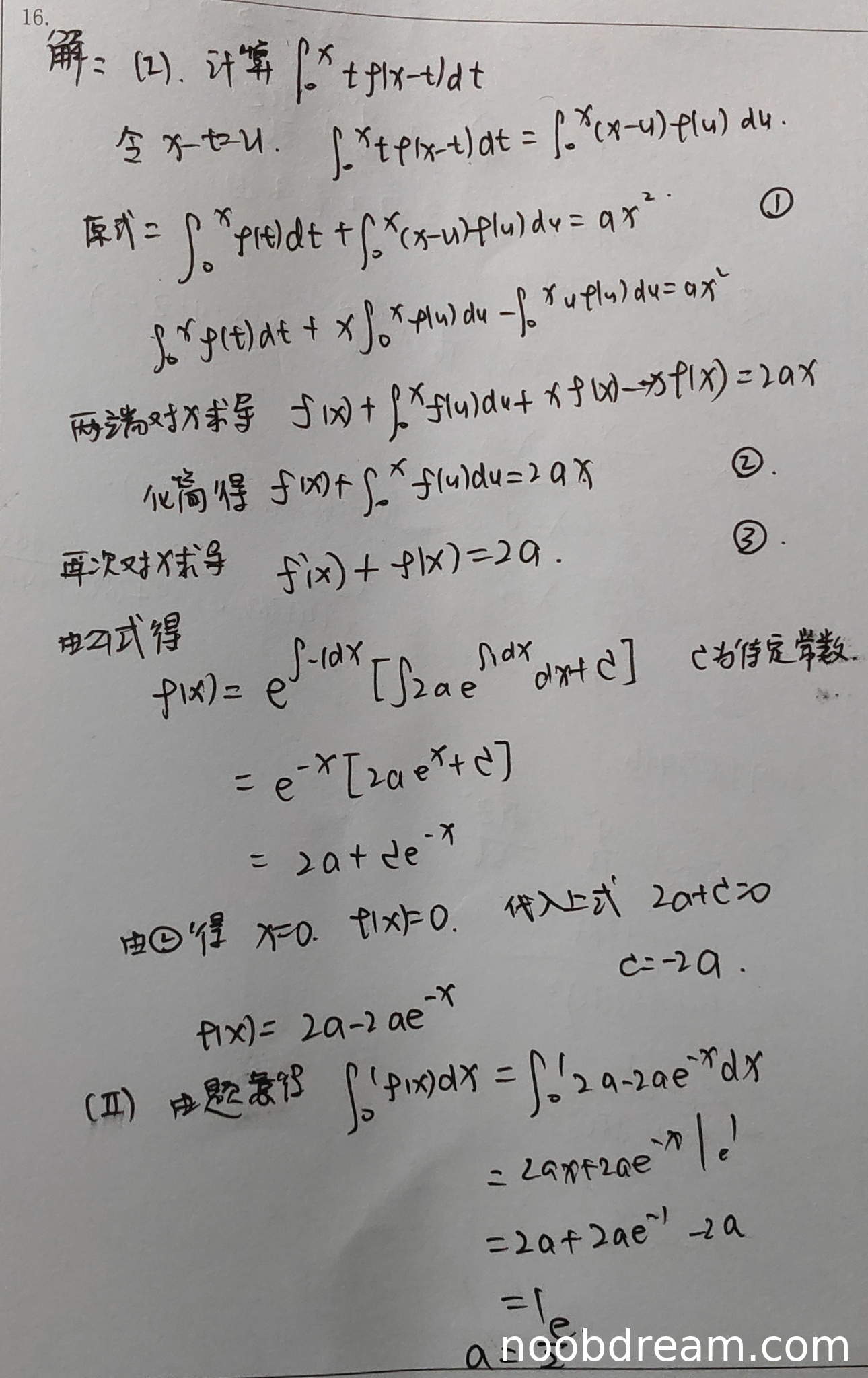 - 两次求导过程正确,第一次求导得到f(x) + ∫₀ˣ f(u)du = 2ax,第二次求导得到f'(x) + f(x) = 2a。