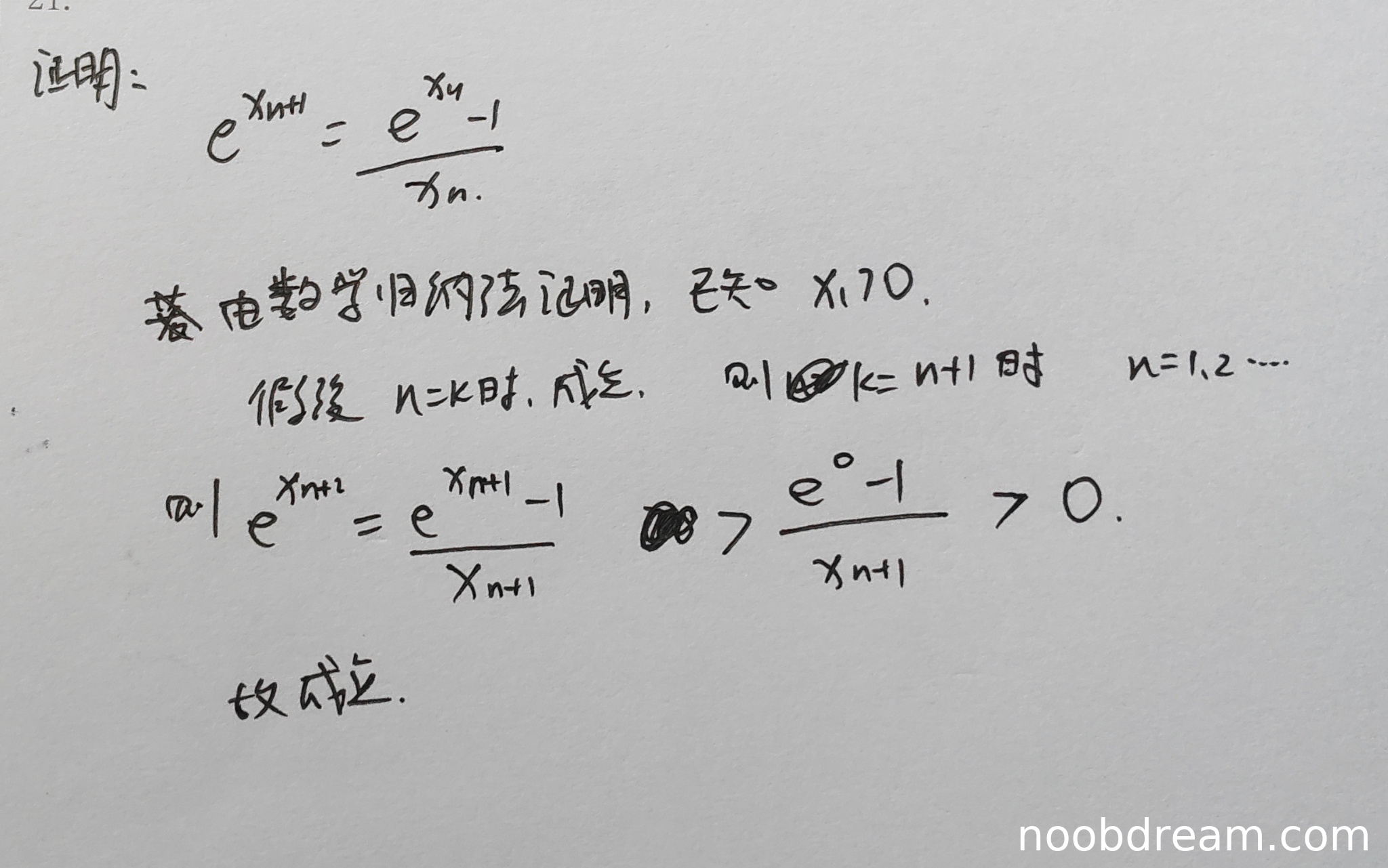 - 学生试图用数学归纳法证明 \(x_n > 0\),但在归纳步骤中错误地写出了 \(e^{x_{n+1}} = \frac{e^{x_{n+1}} - 1}{x_{n+1}}\),这实际上是循环论证,且表达式本身是错误的(应为 \(e^{x_{n+1}} = \frac{e^{x_n} - 1}{x_n}\))。