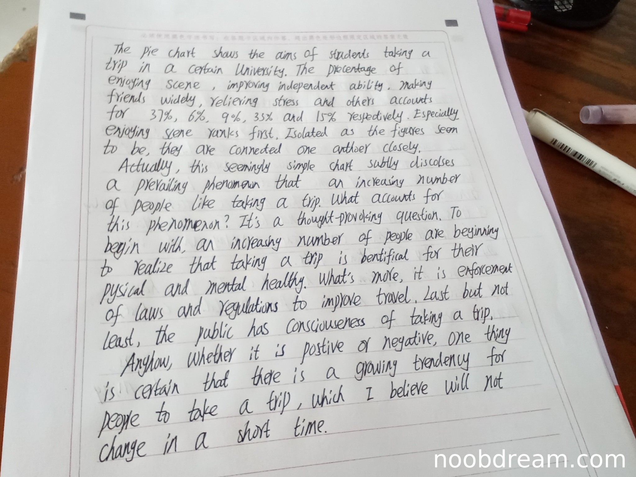 得分:6分。学生基本完成了图表解读任务,准确描述了饼图中各项旅游目的的比例数据,并指出了欣赏风景占比最高这一关键信息。但在评论部分存在明显不足:未能深入分析数据背后的原因(如为什么欣赏风景和缓解压力占主导),而是泛泛讨论旅游流行现象,部分内容(如法律法规完善)与图表数据关联性不强。