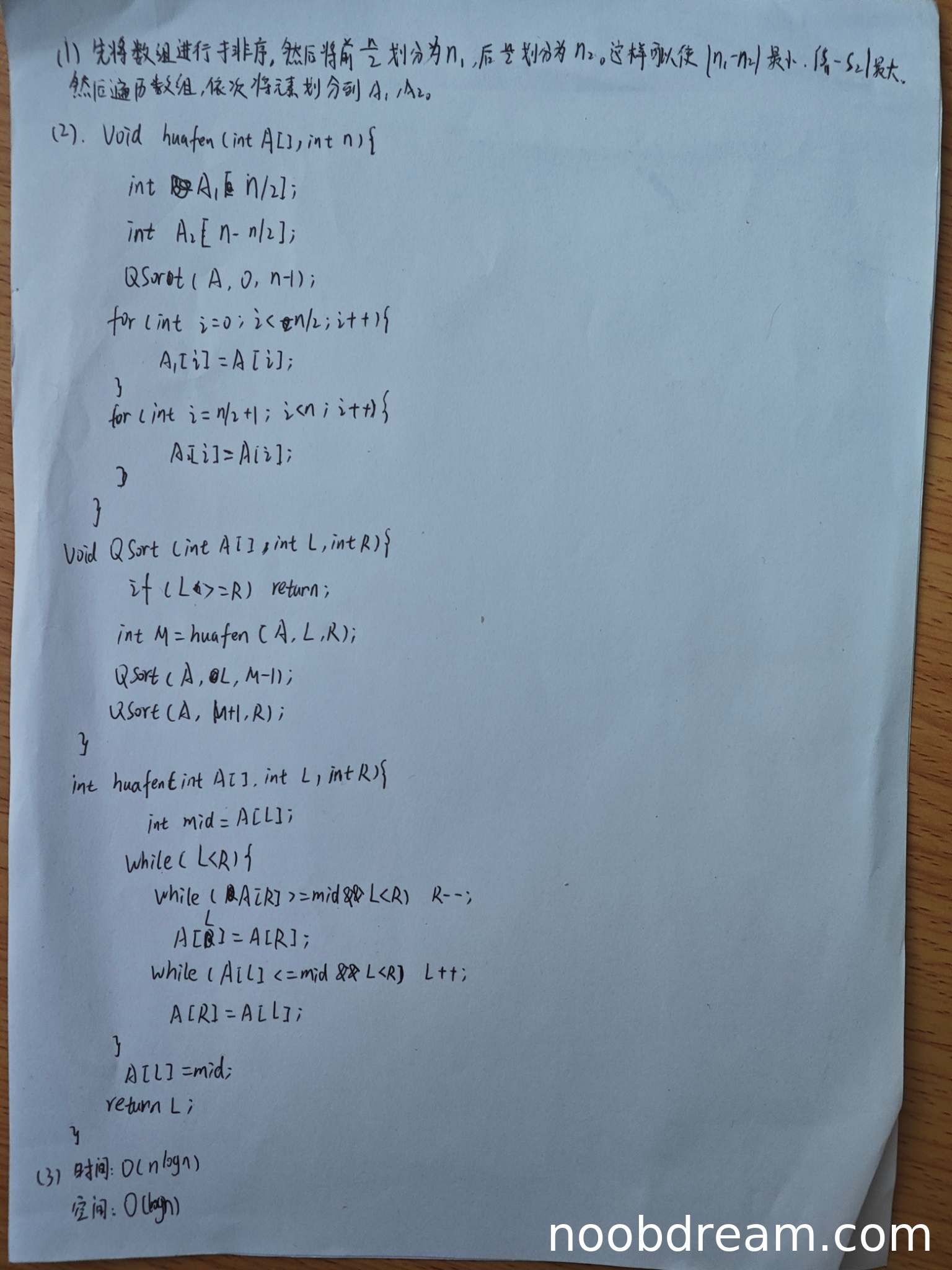 理由:学生答案的基本思路是正确的,通过排序后取前一半和后一半确实能满足题目要求。但是标准答案要求的是"尽可能高效的划分算法",而排序的时间复杂度是O(nlogn),没有达到标准答案中O(n)的快速选择算法的高效要求。因此扣2分。
