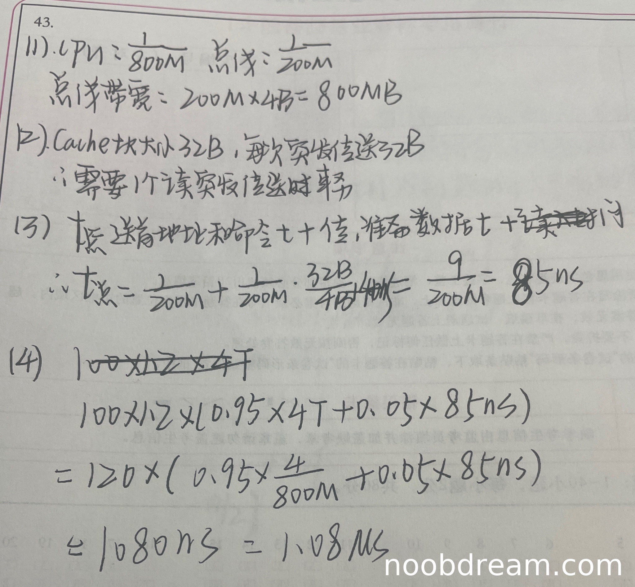 学生答案正确计算了CPU时钟周期(1/800M)、总线时钟周期(1/200M)和总线带宽(800MB/s)。计算过程和结果与标准答案一致。得3分。