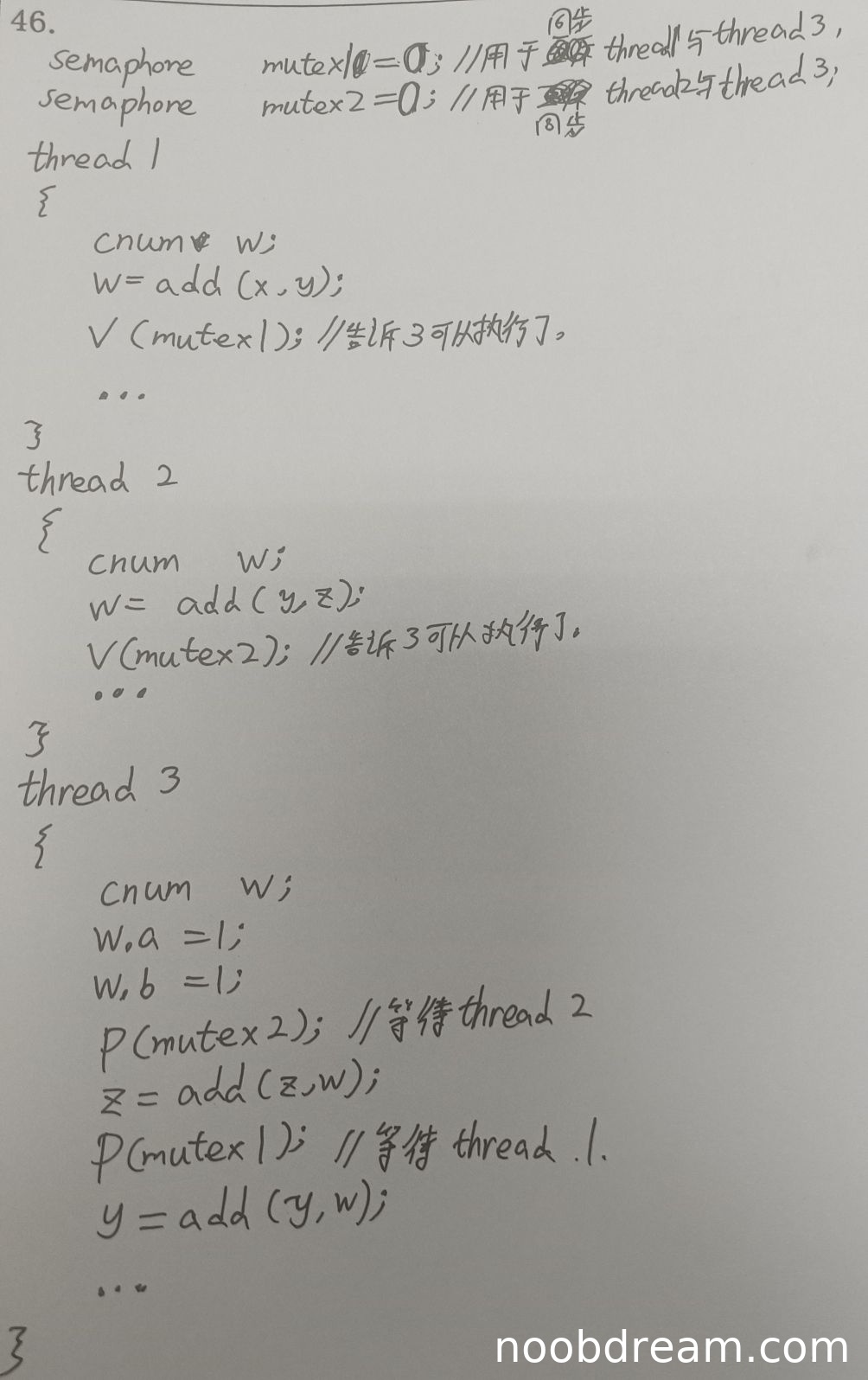 线程3中使用P操作等待其他线程,这是同步操作而非互斥操作。对变量z和y的修改没有进行正确的互斥保护,P操作的位置也不正确。扣3分,得0分。