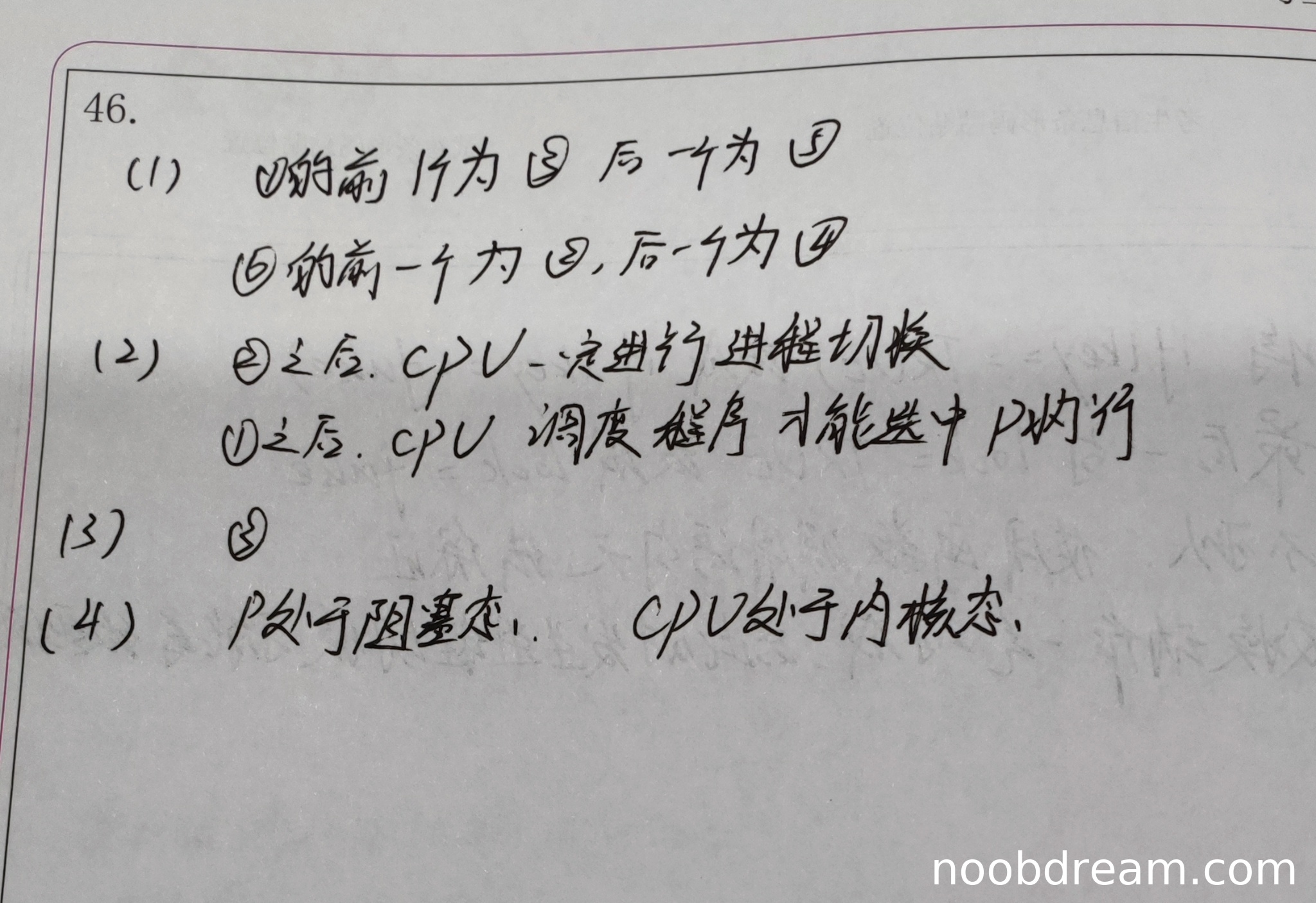 学生答案:②之后,CPU一定进行进程切换;①之后,CPU调度程序才能选中P执行