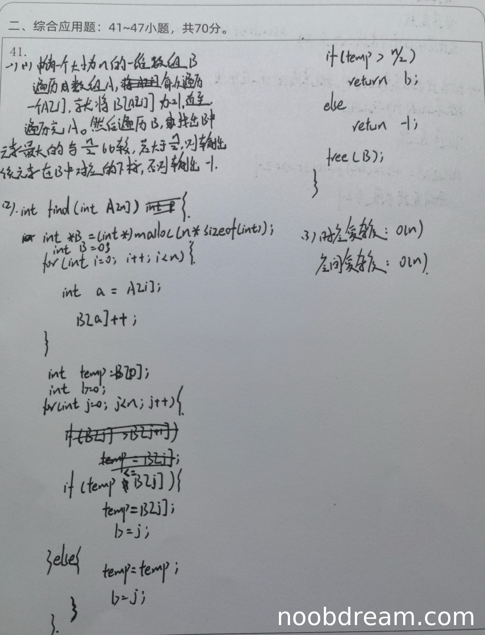 理由:学生的思路是使用计数数组统计每个元素的出现次数,然后找出出现次数最多的元素判断是否超过n/2。这个思路是正确的,能够解决问题,但不是题目要求的"尽可能高效的算法"(标准答案使用摩尔投票法,空间复杂度为O(1))。学生的方法空间复杂度为O(n),不如标准答案优化,但基本思路正确,因此给2分。