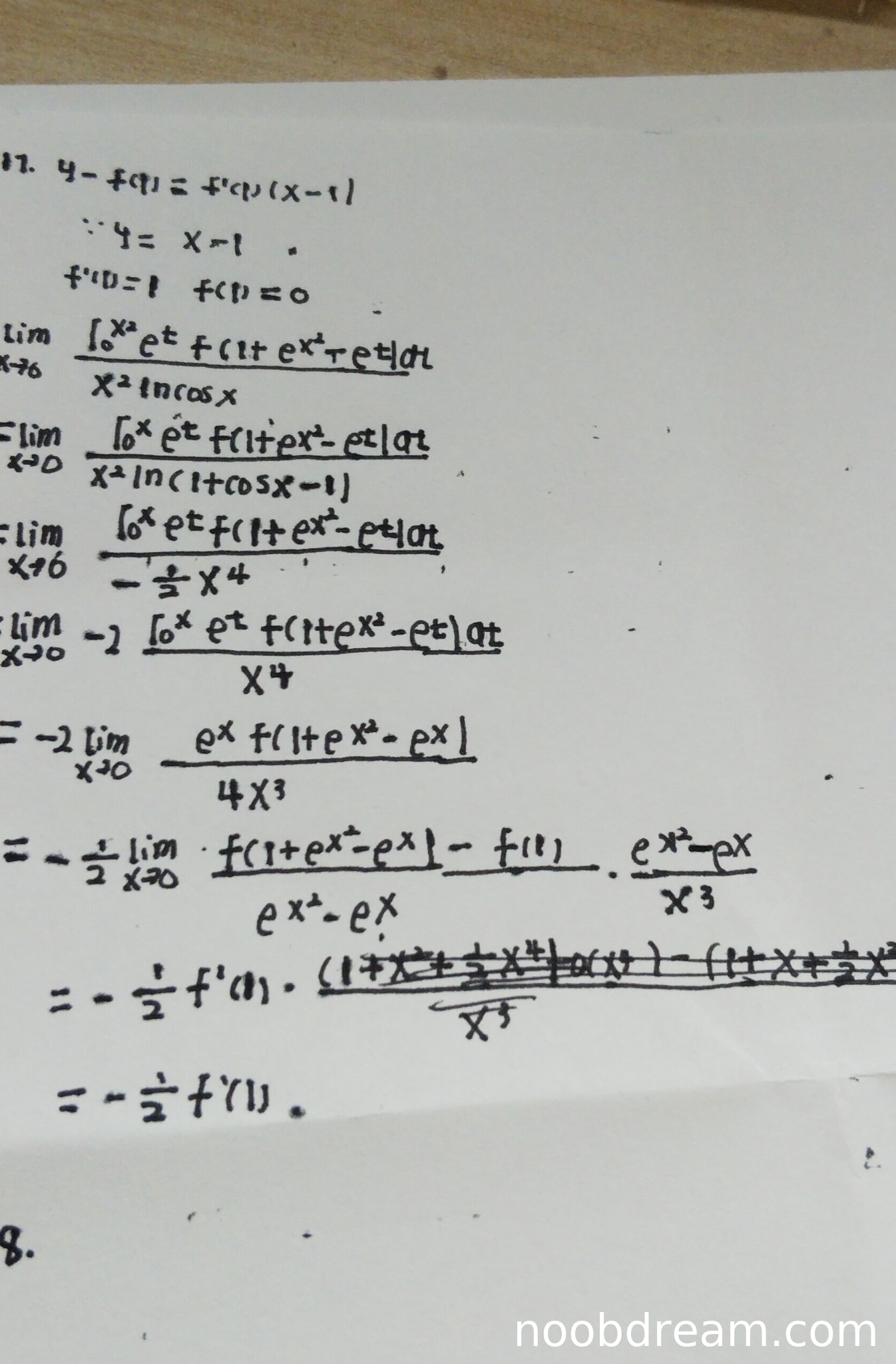 学生作答整体思路正确,能够利用已知条件得出f(1)=0和f'(1)=1,并正确使用等价无穷小替换和洛必达法则。但在关键步骤存在逻辑错误: