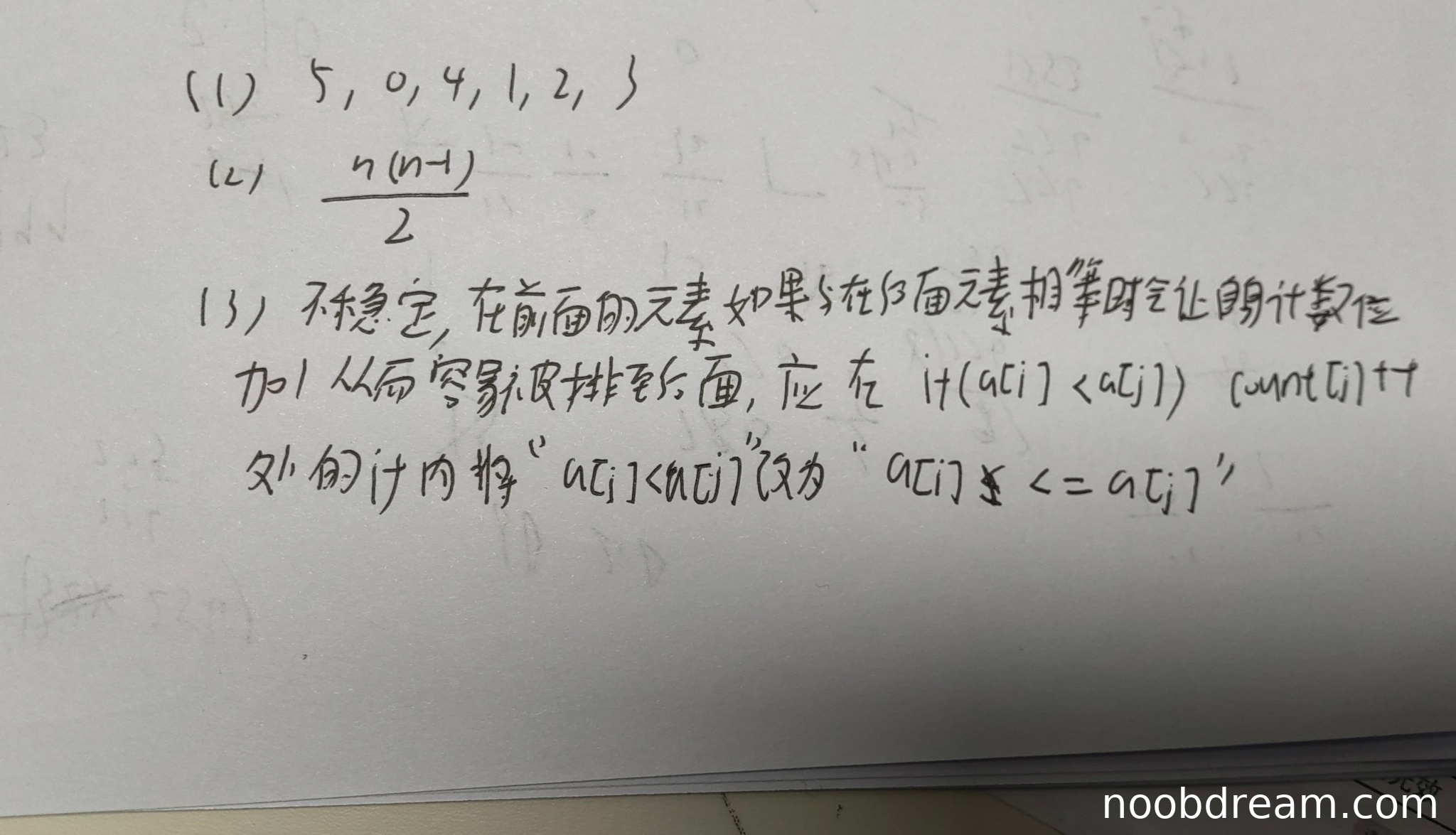 学生正确指出算法不稳定,并分析了不稳定的原因:当相等元素出现时,前面的元素会使自己的count增加,导致排序后相对位置可能改变。学生提出的修改方法是将条件改为"a[i] <= a[j]",但具体修改位置描述有误(学生写的是"if(a[i] < a[j]) count[i]++"处的修改,实际应修改if条件为"a[i] <= a[j]"并保持count[j]++)。由于学生正确指出了不稳定性和修改方向,但具体修改代码描述不准确,扣1分。得3分。