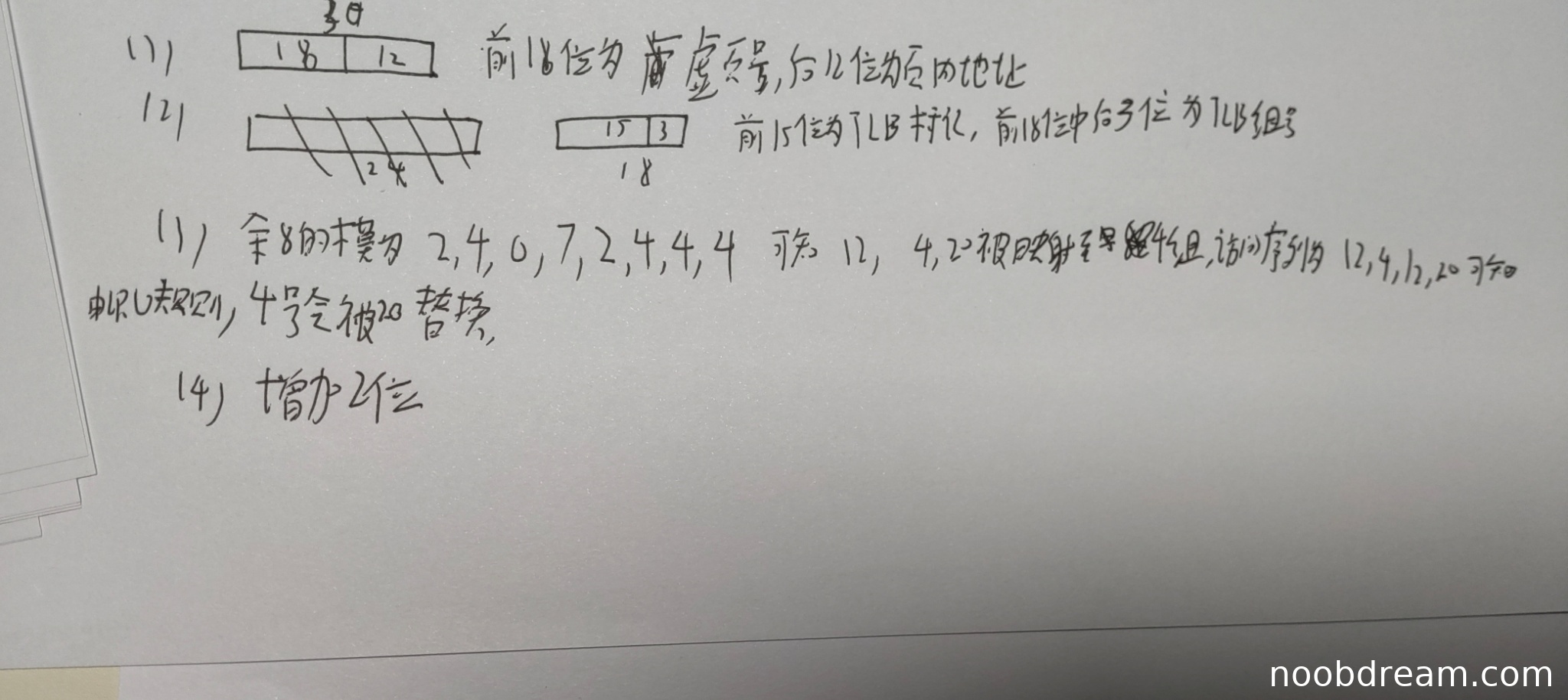 学生回答“前15位为TLB 标识,前18位中后3位为TLB 组号”,其中“标识”应为“标记”,但属于误写不扣分。答案与标准答案一致。得2分。