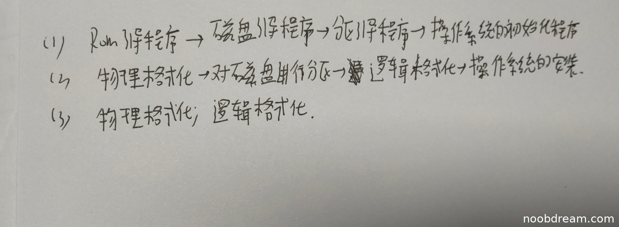 学生答案:物理格式化→对磁盘进行分区→逻辑格式化→操作系统的安装