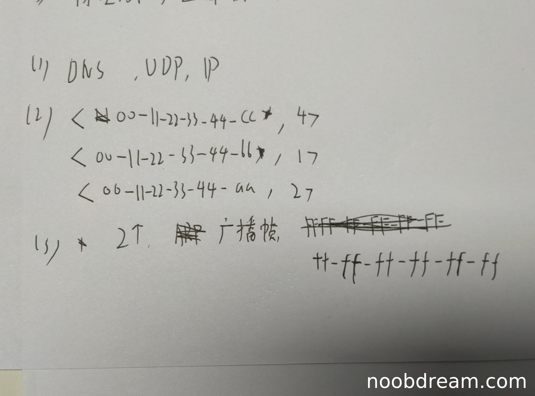 标准答案:2个帧,封装ARP查询报文的以太网帧,目的MAC地址为FF-FF-FF-FF-FF-FF
