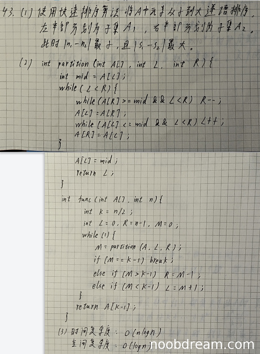 - (-1分)时间复杂度分析错误。学生给出的O(nlogn)是基于快速排序的时间复杂度,但实际使用的是快速选择算法,平均时间复杂度应为O(n)