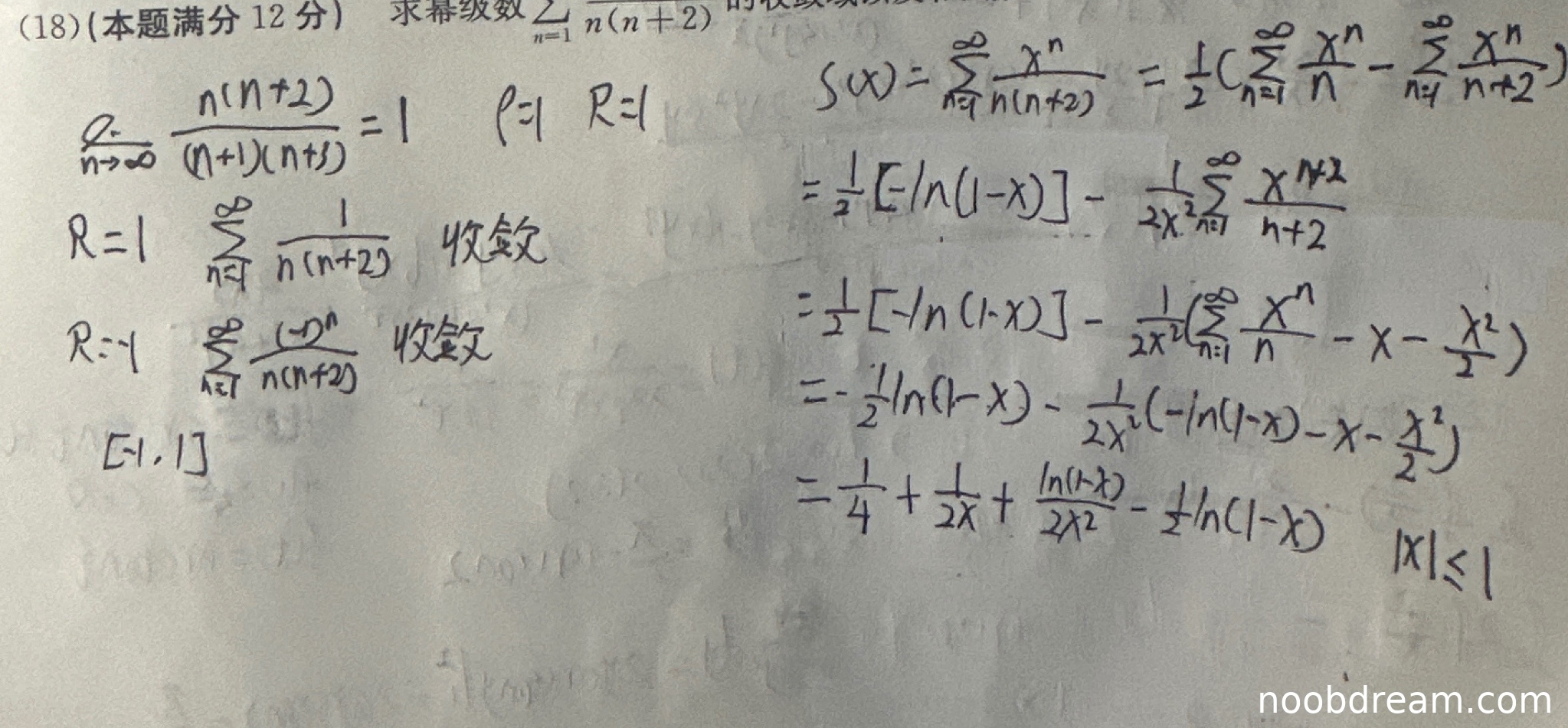 主要问题:未讨论x=1时的和函数值。标准答案中通过极限计算得到S(1)=3/4,学生作答中缺少这部分内容。