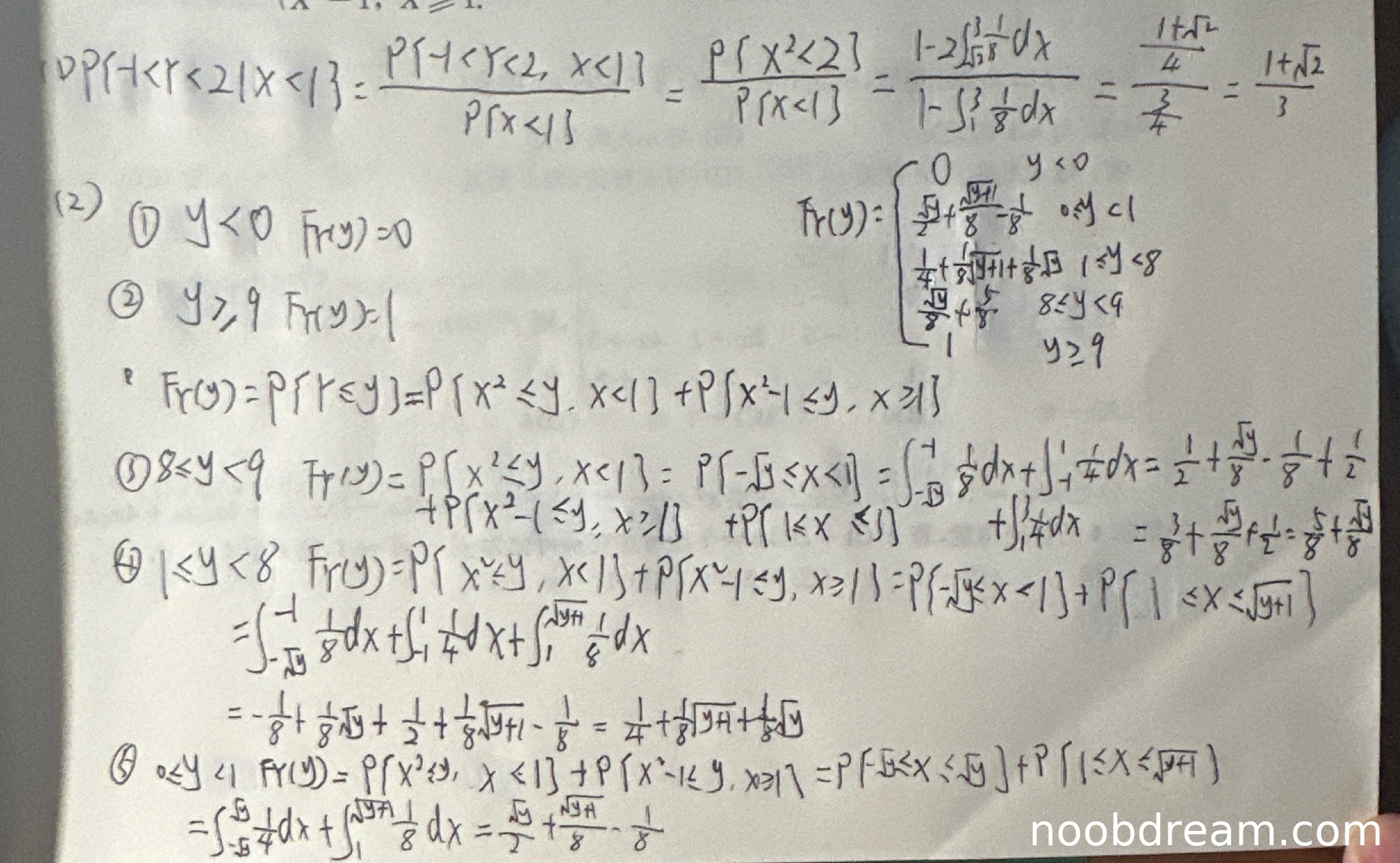 - 正确思路应为:当 \(X < 1\) 时,\(Y = X^2\),因此 \(P\{-1 < Y < 2 \mid X < 1\} = \frac{P\{-1 < X^2 < 2, X < 1\}}{P\{X < 1\}}\)。