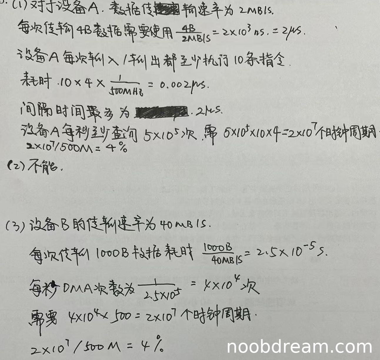学生正确计算了设备B每次DMA传送时间(2.5×10⁻⁵s),正确得出每秒DMA次数(4×10⁴次),正确计算了CPU用于设备B的时钟周期数(2×10⁷个周期)和时间占比4%。计算过程和结果与标准答案完全一致。得2分。