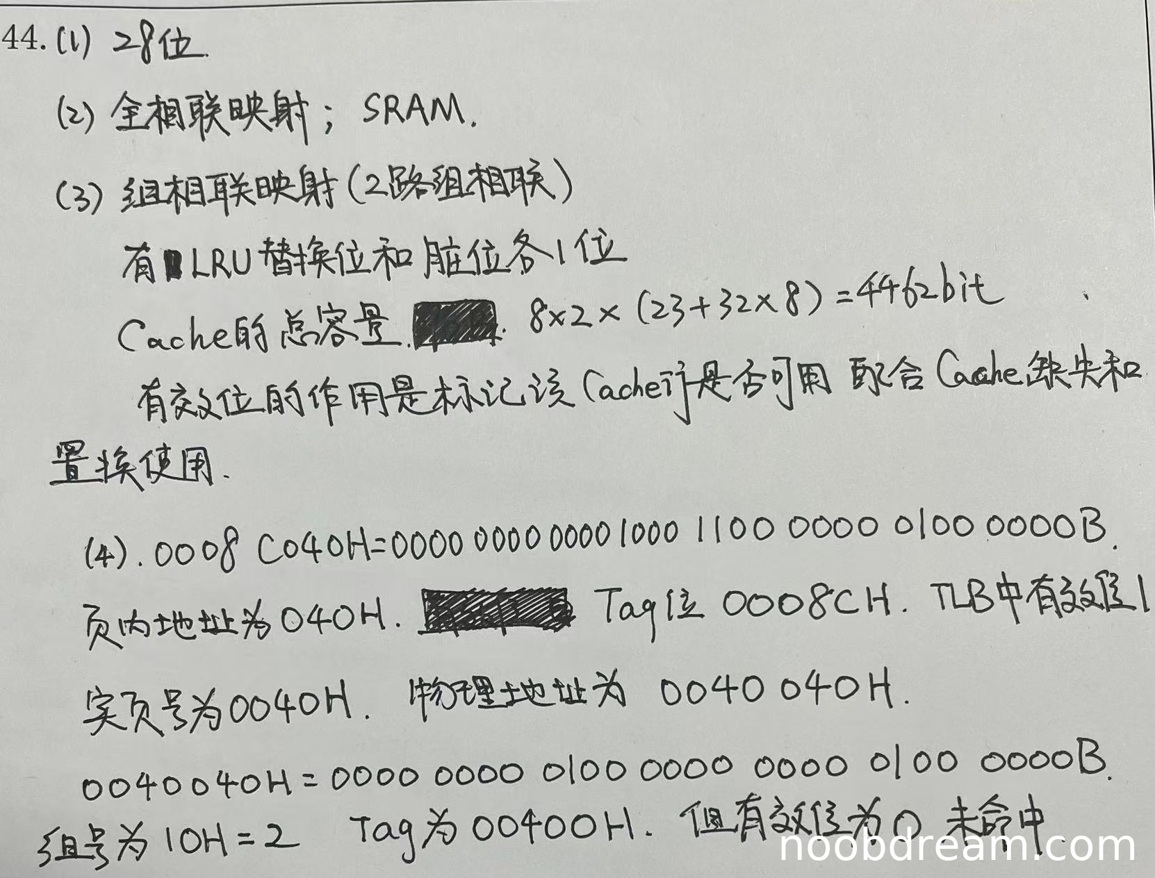 第三问未回答组号计算问题(标准答案要求计算虚拟地址0007C260H的Cache组号),得0分;