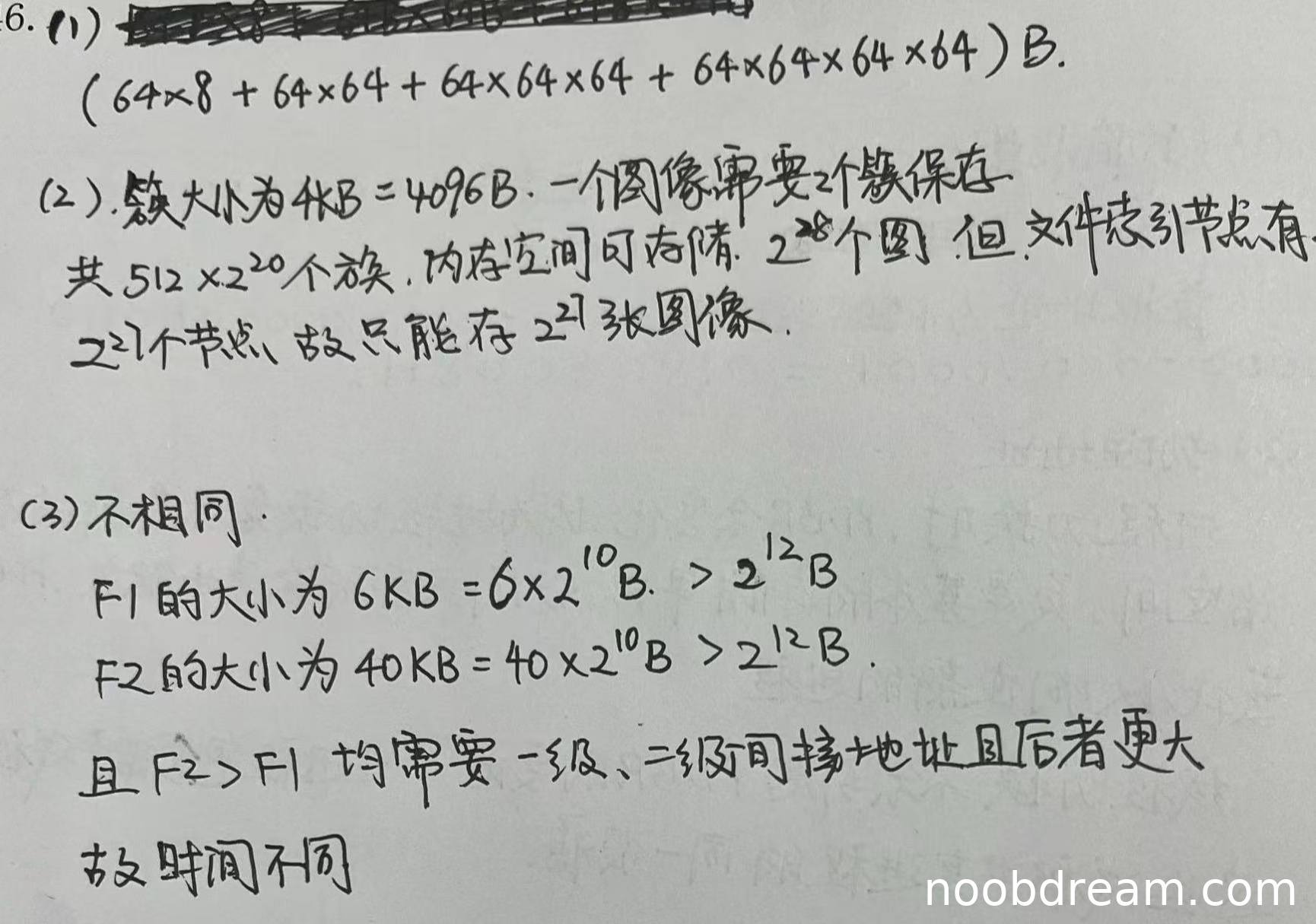学生正确判断了时间不相同,但理由错误。学生提到F1和F2均大于2¹²B(即4KB),且F2>F1,认为两者都需要一级、二级间接地址,且后者更大导致时间不同。实际上,根据标准答案,F1(6KB)仅需访问直接地址项(因为≤32KB),而F2(40KB)需要访问一级间接地址项,因此F2需要多一次磁盘访问,时间更长。学生未能正确分析地址项访问级别,逻辑错误,扣2分。