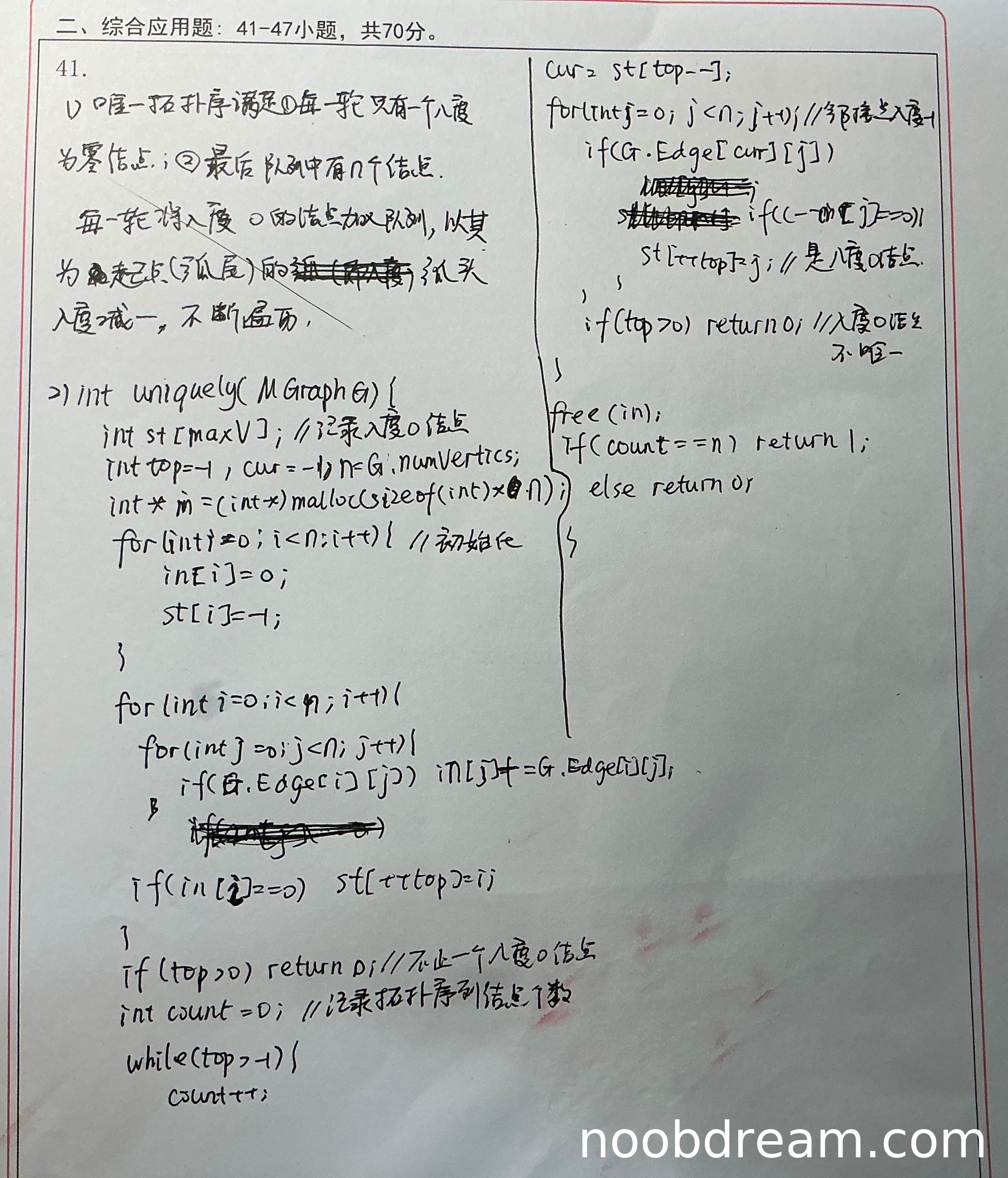if(top > 0) return 0;判断,这会导致如果初始时有2个入度为0的结点(top=1)会返回0,但如果有3个或更多(top>1)时,这个判断会漏掉,因为条件只检查>0而不是>1。正确应检查是否大于1个入度为0的结点,即if(top > 0)应改为if(top > 1)或if(top >= 1)(因为top是索引,实际数量是top+1)。这里是一个逻辑错误,扣1分。if(top > 0) return 0;同样存在上述问题,应检查是否有多于1个入度为0的结点(即top>=1),这里也扣1分。题目总分:4+7=11分