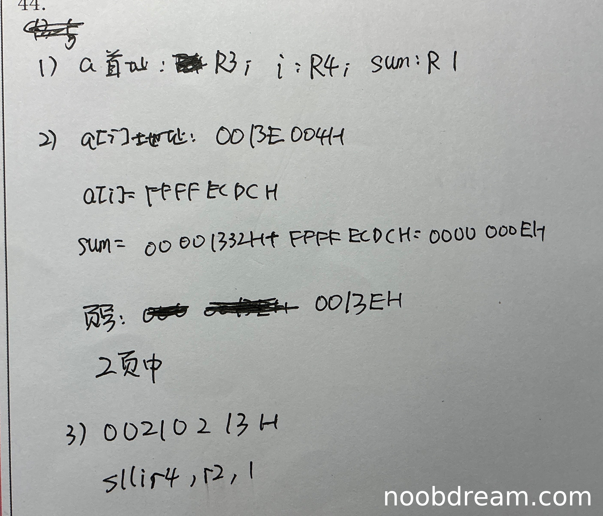 学生答案中:a首址:R3;i:R4;sum:R1。标准答案为:数组a首地址寄存器编号03H(即r3),变量i寄存器编号02H(即r2),sum寄存器编号01H(即r1)。学生将i的寄存器写为R4,而实际上指令序列中第一行"slli r4, r2, 2"表明r2是i(左移2位用于int数组索引计算),因此学生将i的寄存器识别错误。但a首址和sum的寄存器正确。本题共3分,每个寄存器1分,因此扣1分,得2分。