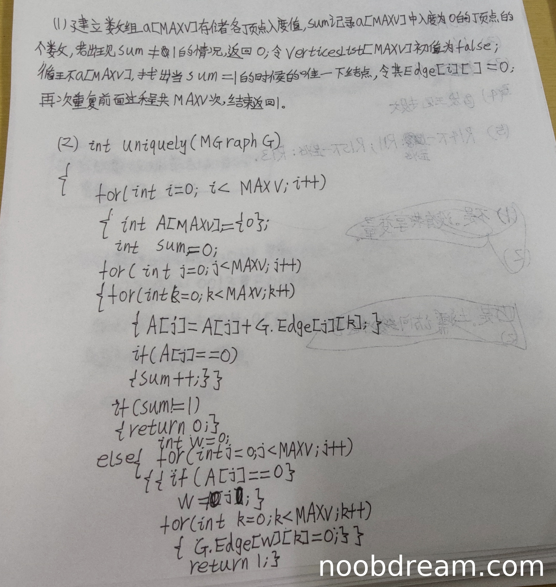 for(int i = 0; i < MAXV; i++),但MAXV是常量,可能大于实际顶点数G.numVertices,应使用G.numVertices。A[j] = A[j] + G.Edge[j][k];实际计算的是顶点的出度,而非入度。正确应计算G.Edge[k][j](即列和)。if(A[j] == 0)并累加sum,这会导致sum统计不准确。G.Edge[w][k] = 0;修改原图,但标准方法应更新入度数组,且修改原图可能影响后续操作。尽管代码结构有拓扑排序的雏形,但核心逻辑(入度计算、唯一性判断、更新操作)均错误,扣6分。考虑到部分思路正确(如使用数组记录、查找入度为0顶点),给予3分。