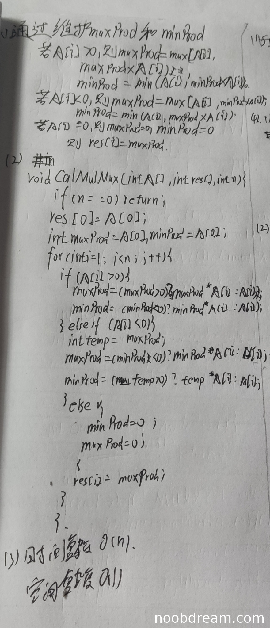 学生答案正确描述了动态规划思想,同时维护maxProd和minProd来处理正负数情况,思路与标准答案一致。但在具体条件描述上存在一些不准确之处:对于A[i]>0的情况,maxProd的计算应该是max(maxProd*A[i], A[i]),而学生描述为"maxProd = max(maxProd, maxProd * A[i])"有误(括号内应该是maxProd*A[i]与A[i]比较,而不是maxProd与maxProd*A[i]比较)。但由于整体思路正确,扣1分。