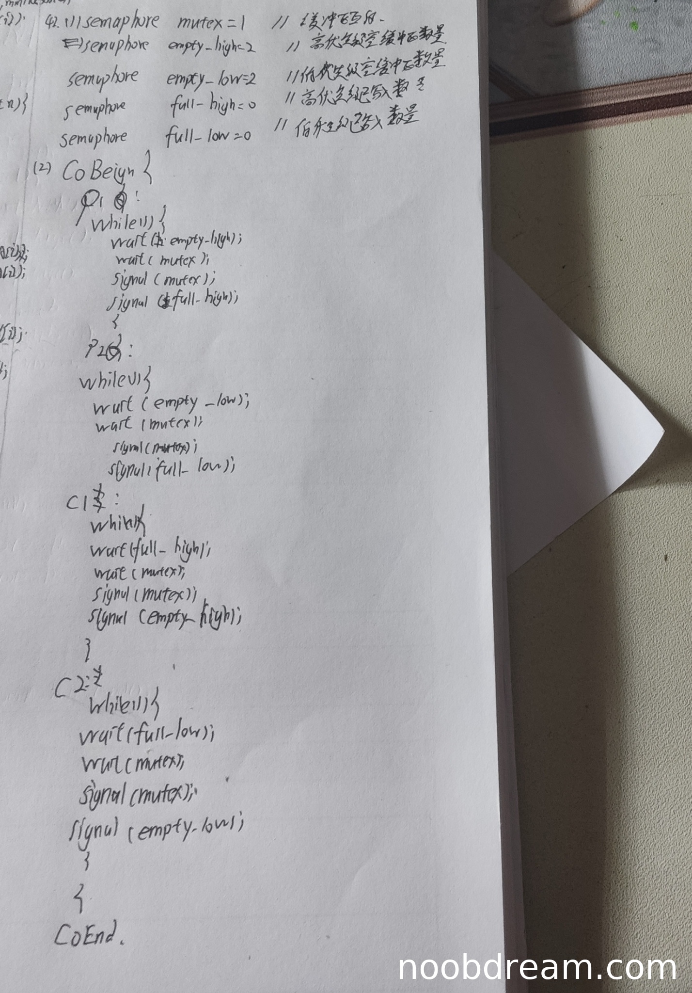 虽然基本的信号量wait/signal操作顺序正确,但缺少关键的缓冲区管理逻辑和进程执行控制,只能给2分。
