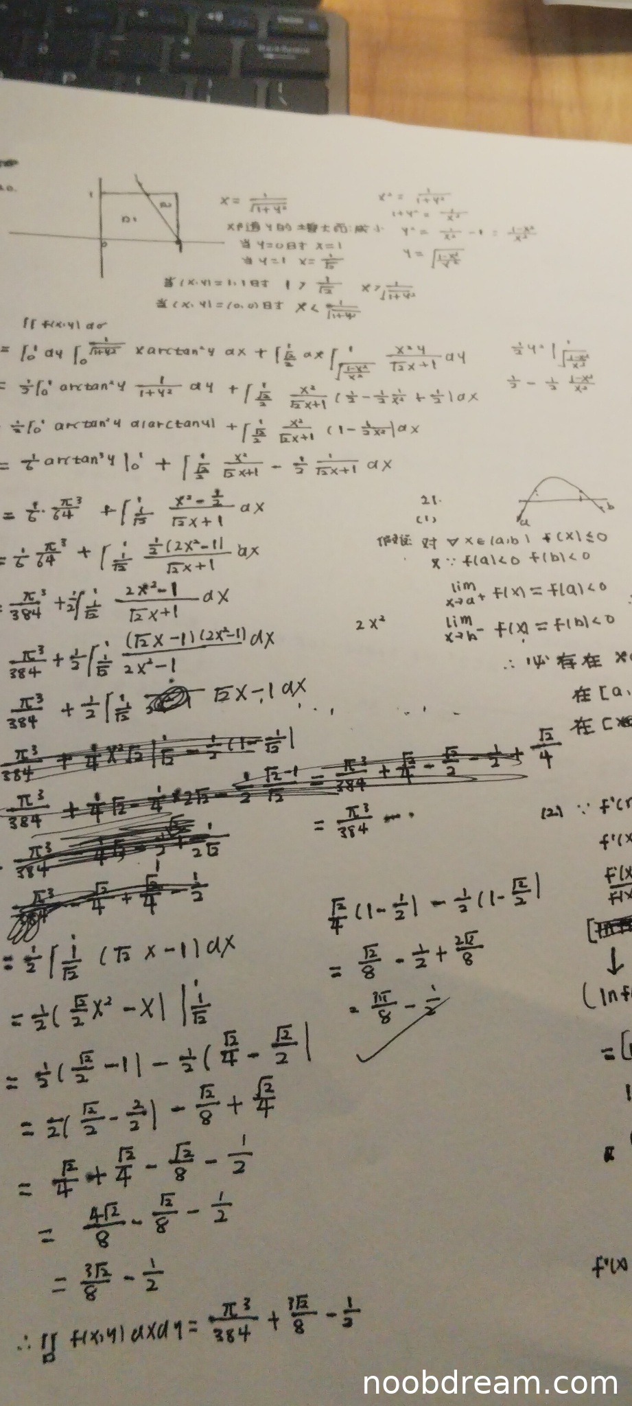 学生作答中只给出了二重积分的计算过程,且计算过程与标准答案基本一致。从识别结果看,学生已经正确地将区域分割并计算了两个部分的积分: