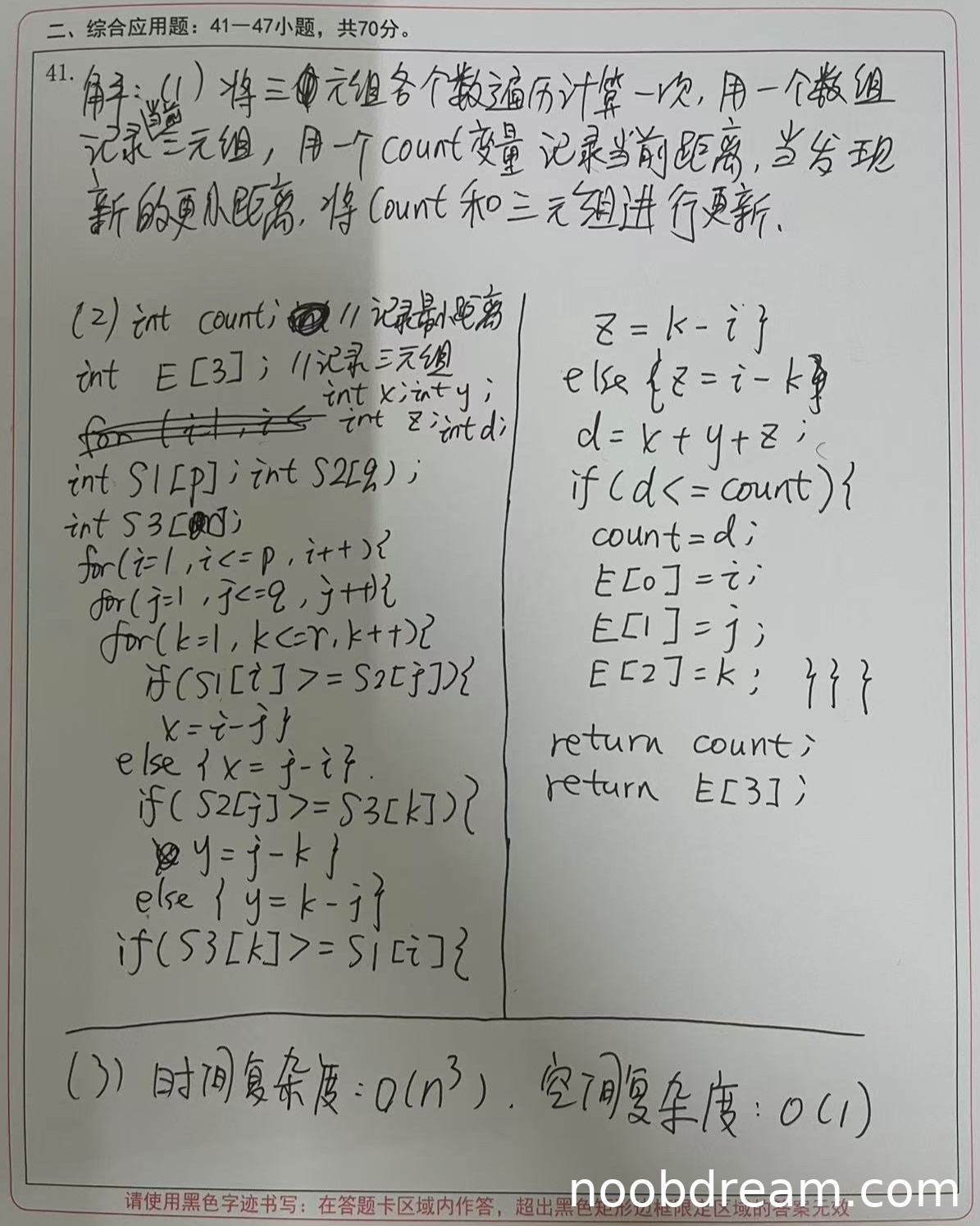 得分:2分。理由:时间复杂度和空间复杂度分析正确,三重循环时间复杂度为O(n³),只使用常数个变量空间复杂度为O(1)。