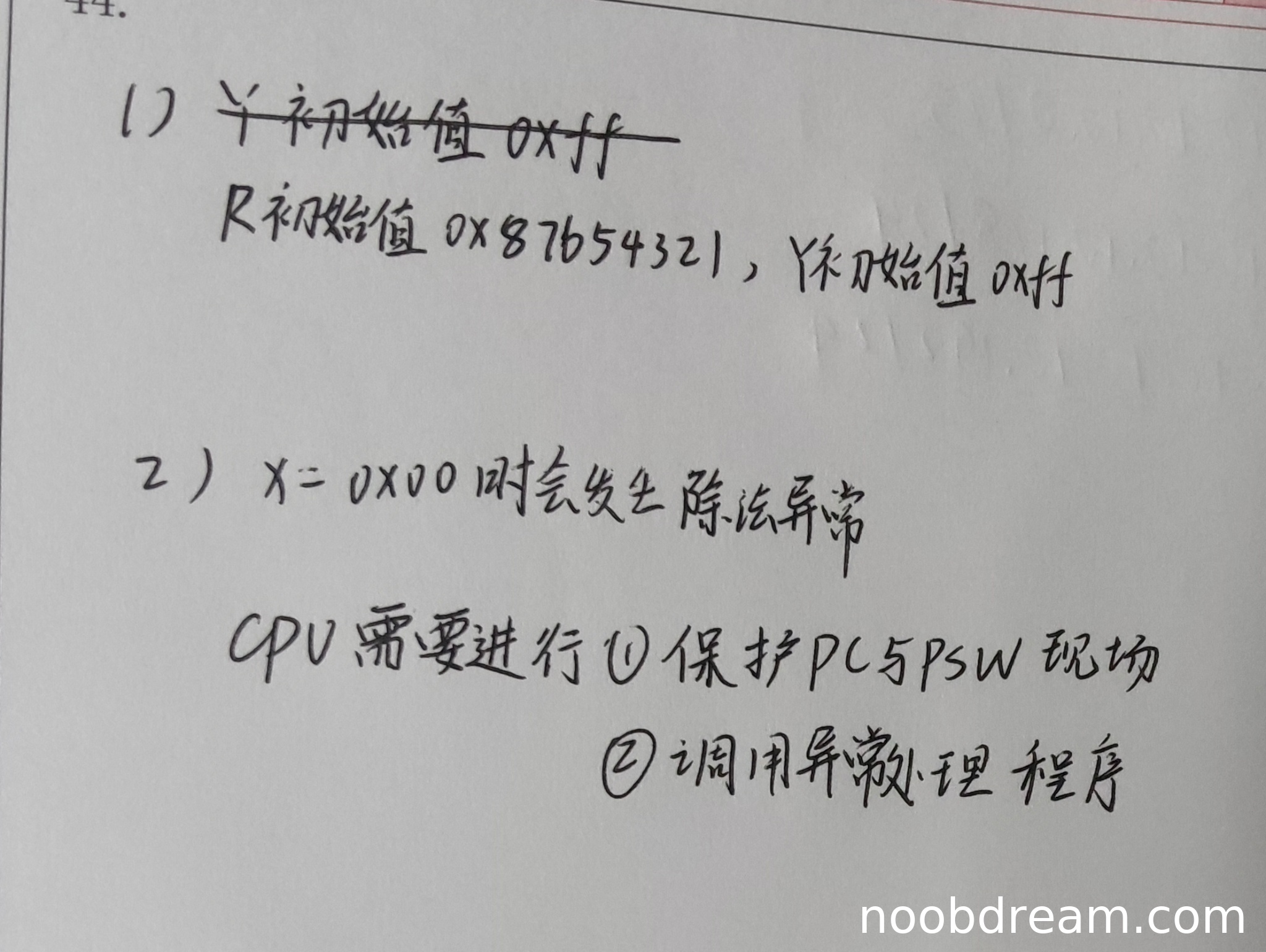 学生正确识别了除数为0的情况(X=0x00),但未识别溢出异常情况(d[i]=0x80000000且x=0xffffffff)。在异常响应操作方面,学生答出了"保护PC与PSW现场"和"调用异常处理程序",但缺少"关中断"和"修改CPU状态为内核态"的细节。根据标准答案,本小题共6分,学生答对部分异常情况(2分)和部分响应操作(2分),但要点不完整,扣2分。