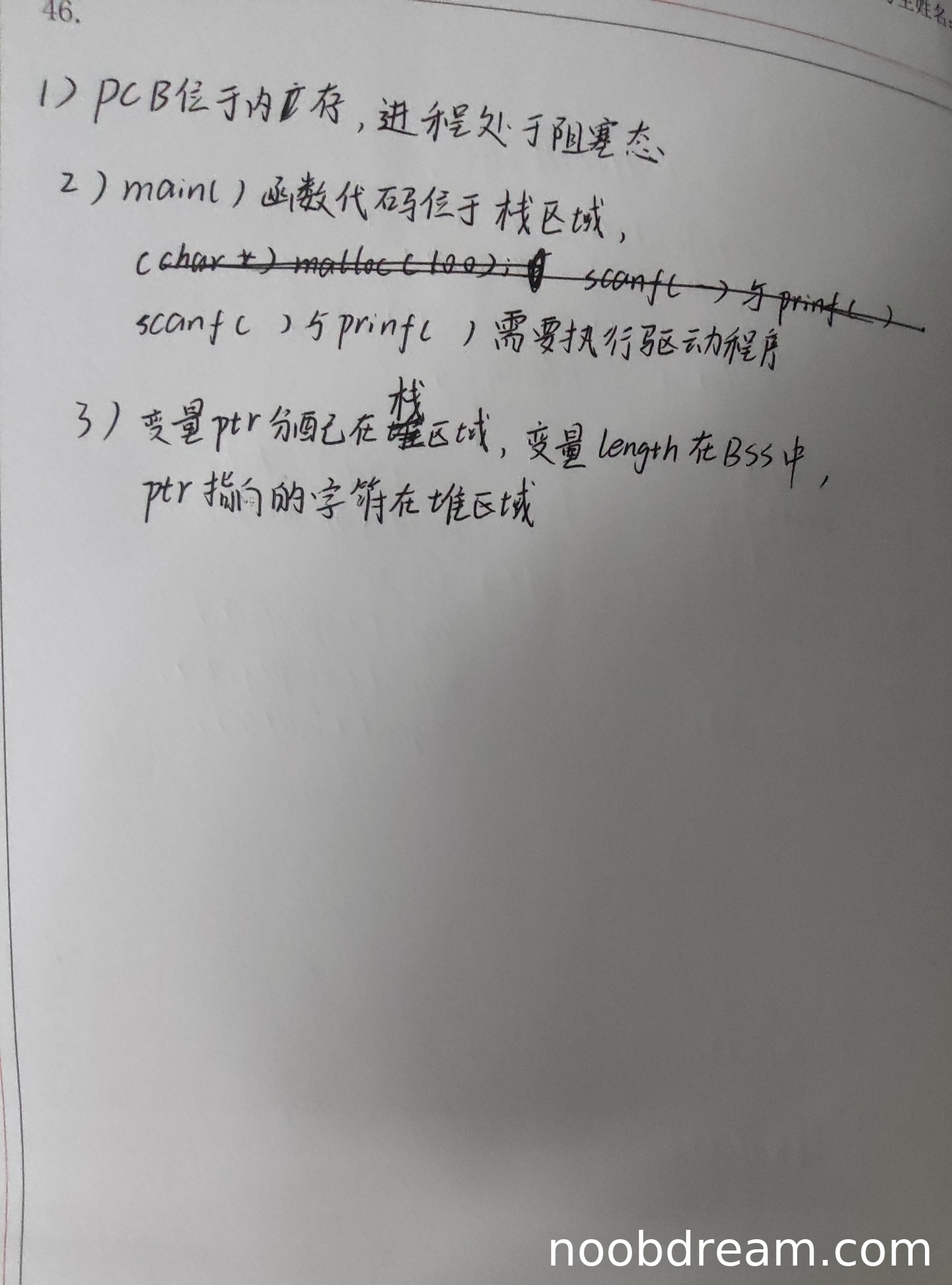 学生回答"main()函数代码位于栈区域"错误,应为"只读代码段";但正确识别了scanf()和printf()需要执行驱动程序。由于主要逻辑错误,扣2分。得分:1分。