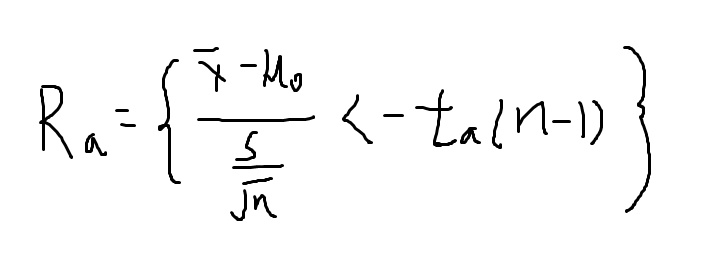 学生作答与标准答案完全一致:$R_{\alpha}=\left\{\frac{\overline{X}-\mu_{0}}{\frac{S}{\sqrt{n}}} < -t_{\alpha}(n - 1)\right\}$