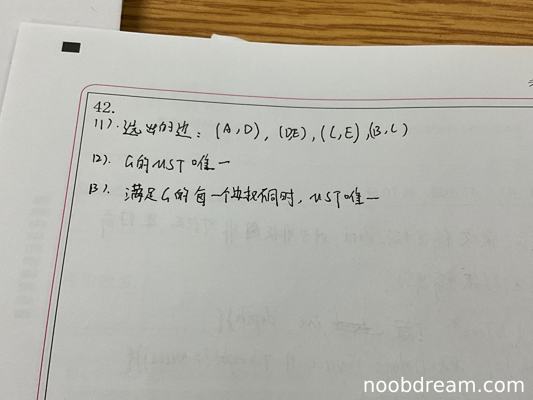 学生回答“满足G的每一个块权不同时,MST唯一”。这里的“块权”可能是指“边的权值”,但表述不够准确。标准答案是“任意一个环中所包含的边的权值均不相同”,学生的回答虽然意思接近,但“每一个块权不同”可能被理解为所有边的权值都不同,而实际上只需要每个环中的边权不同即可。由于表述不严谨,但核心思路正确,扣1分。因此得1分。