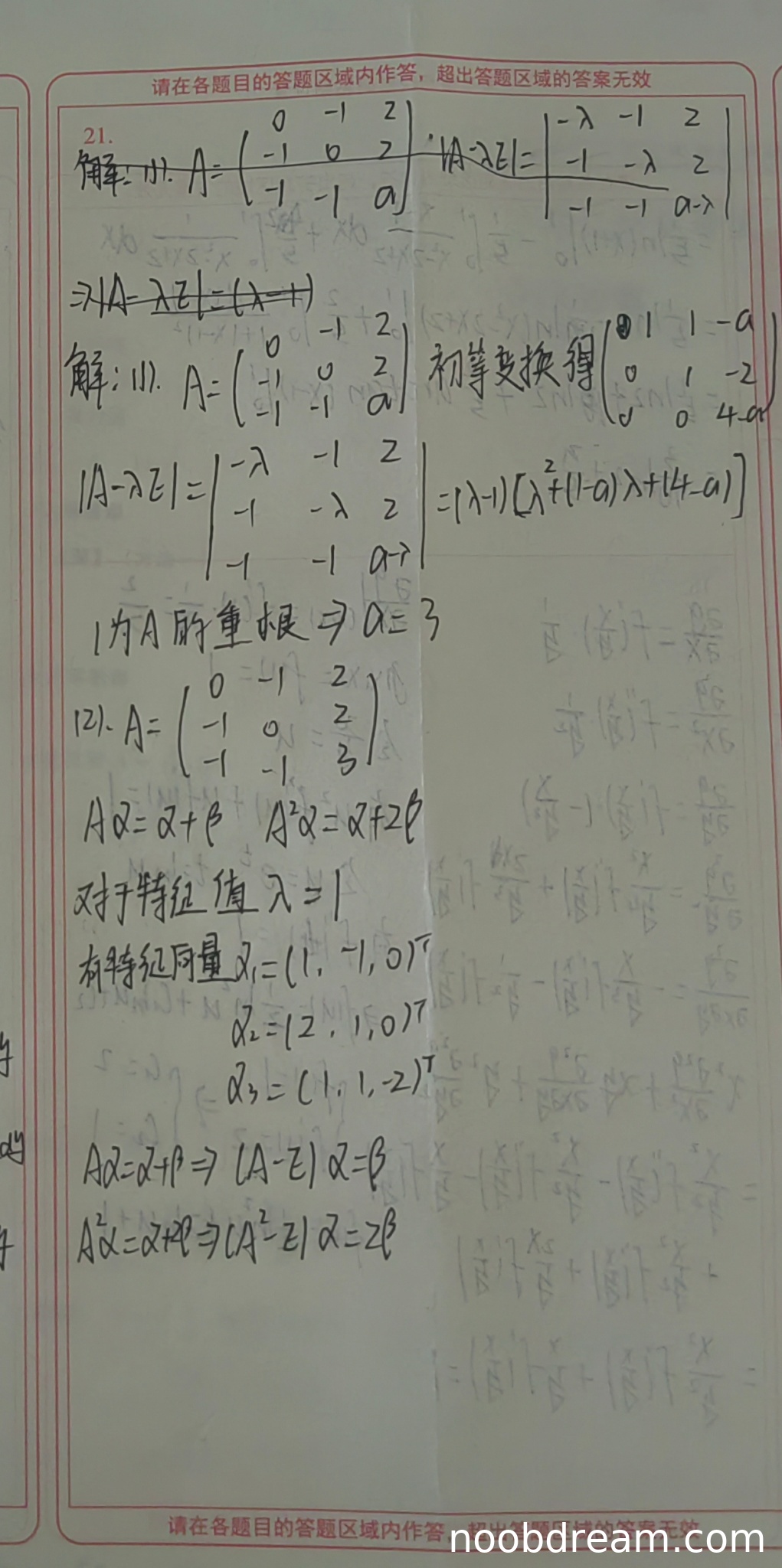学生正确写出矩阵A,列出方程组并转化为(A-E)α=β和(A²-E)α=2β的关系,但后续处理存在严重问题: