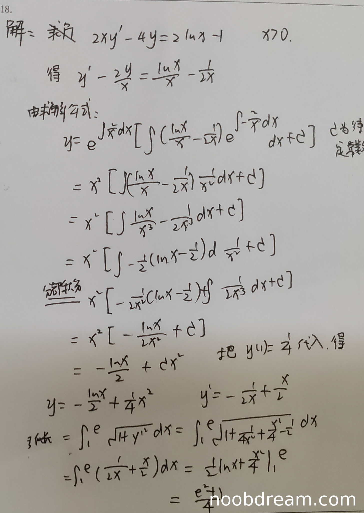 学生正确写出弧长公式并代入导数 \(y' = \frac{x}{2} - \frac{1}{2x}\)。在计算 \(1 + (y')^2\) 时,展开得到: \[ 1 + \left(\frac{x}{2} - \frac{1}{2x}\right)^2 = 1 + \frac{x^2}{4} - \frac{1}{2} + \frac{1}{4x^2} = \frac{x^2}{4} + \frac{1}{2} + \frac{1}{4x^2} \] 但学生错误写为 \(\frac{1}{4x^2} + \frac{x^2}{4} + \frac{1}{2}\)(顺序不同不影响),并正确识别为 \(\left(\frac{x}{2} + \frac{1}{2x}\right)^2\)。然而,在最后定积分计算中,学生得到: \[ \left[\frac{1}{2}\ln x + \frac{x^2}{4}\right]_{1}^{e} = \frac{1}{2} + \frac{e^2}{4} - \frac{1}{4} = \frac{e^2}{4} + \frac{1}{4} \] 但最终答案误写为 \(\frac{e^2}{4}\),缺少了常数项 \(\frac{1}{4}\)。此计算错误导致最终结果不正确,扣除2分,得4分。