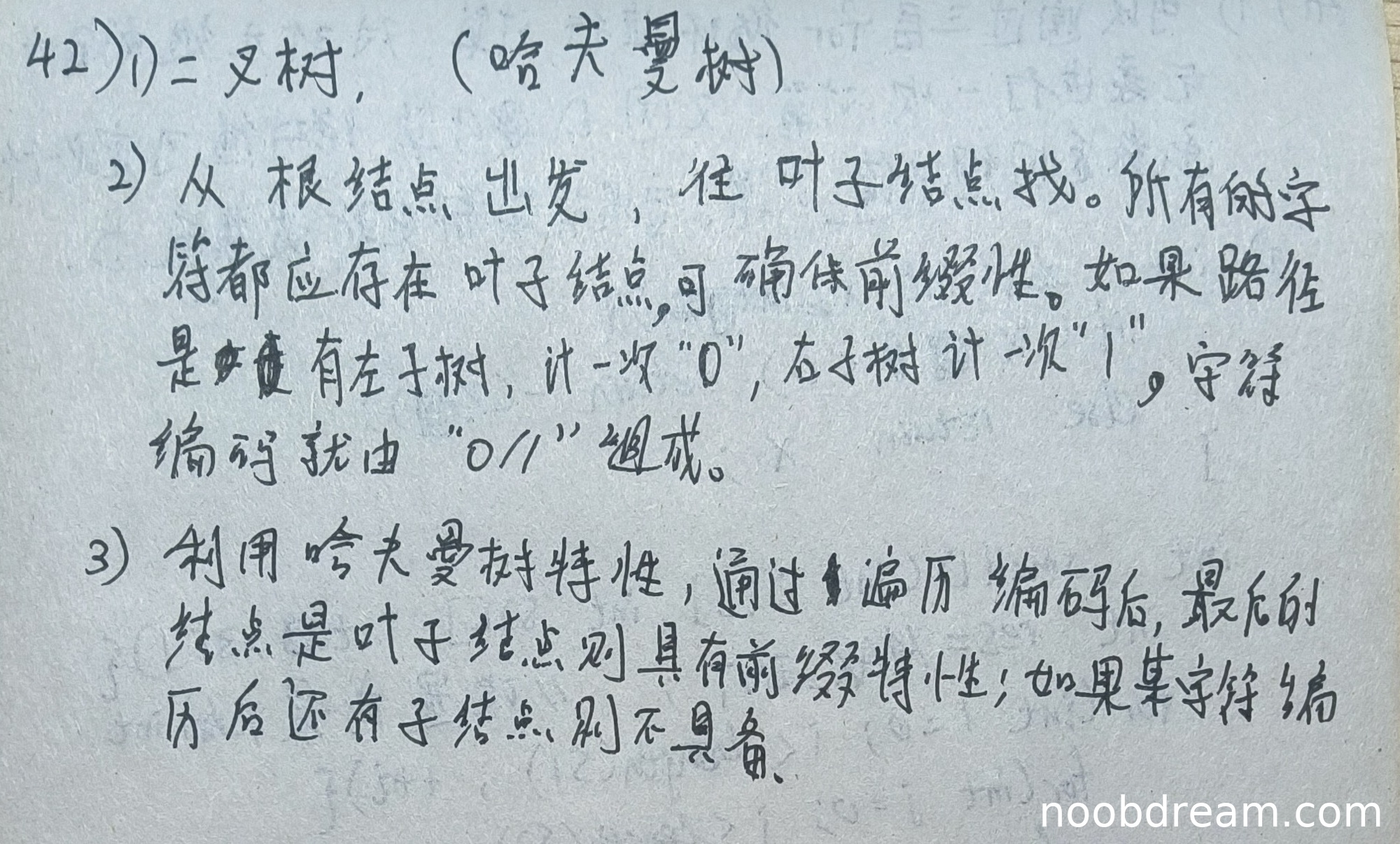 学生提到“利用哈夫曼树特性,通过遍历编码后,最后的结点是叶子结点则具有前缀特性;如果某字符遍历后还有子结点则不具备”,这准确描述了前缀特性的判定方法:所有字符编码必须对应到叶子结点。回答完整正确,得满分3分。