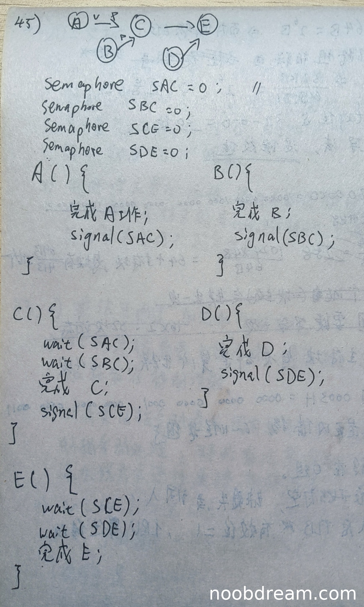 学生答案与标准答案基本一致,正确使用了四个信号量(SAC、SBC、SCE、SDE)且初值均为0,准确描述了操作之间的同步关系: