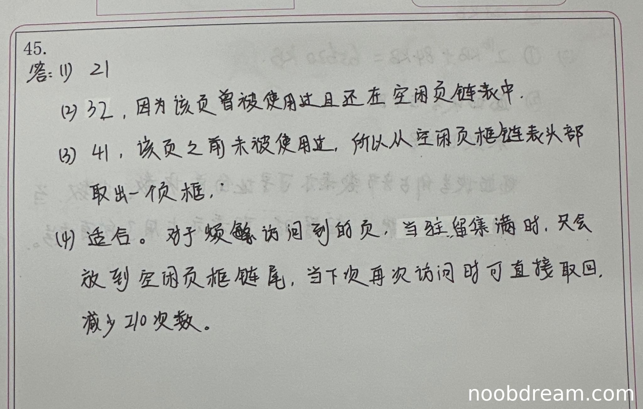 学生答案正确,页框号为41,理由正确指出该页之前未被使用过,所以从空闲页框链表头部取出页框。得2分。